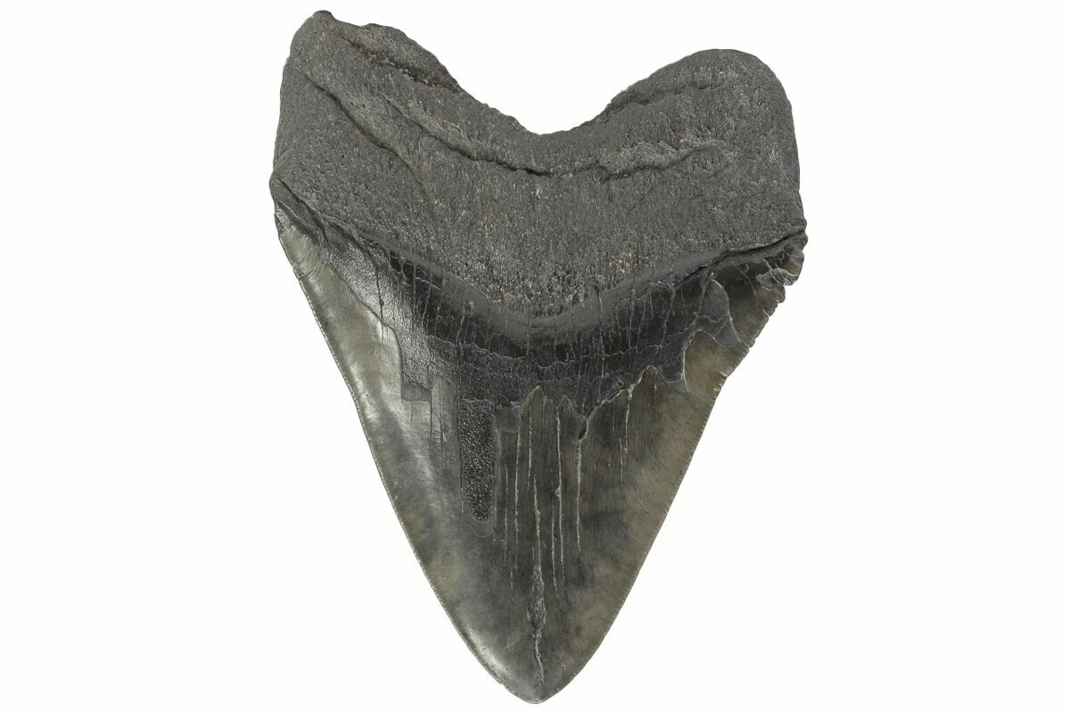 The standard measure for megalodon teeth is slant height, or the longest edge of the tooth. Adult megalodon teeth were typically in the 4 to 5 inch range: teeth over 6 inches are rare and represent super-sized individuals. Only a handful of teeth have ever been found over seven inches.