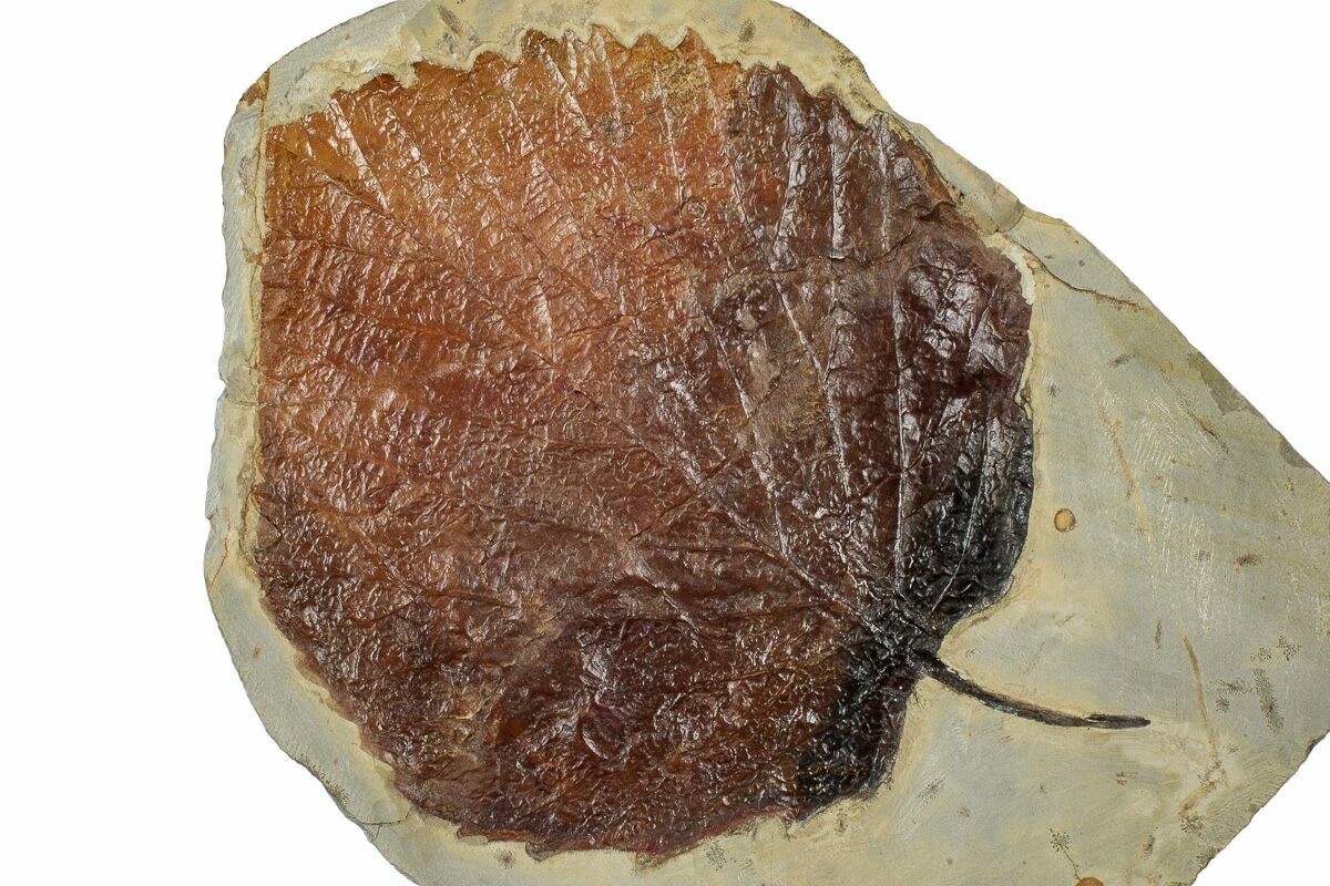 This is a gorgeous, 6.05" long (including stem) fossil leaf (Davidia antiqua) from the Fort Union Formation near Glendive, Montana. The orange/brown preservation contrasts well against the shale, and many of the details in the leaf can be seen in good relief.