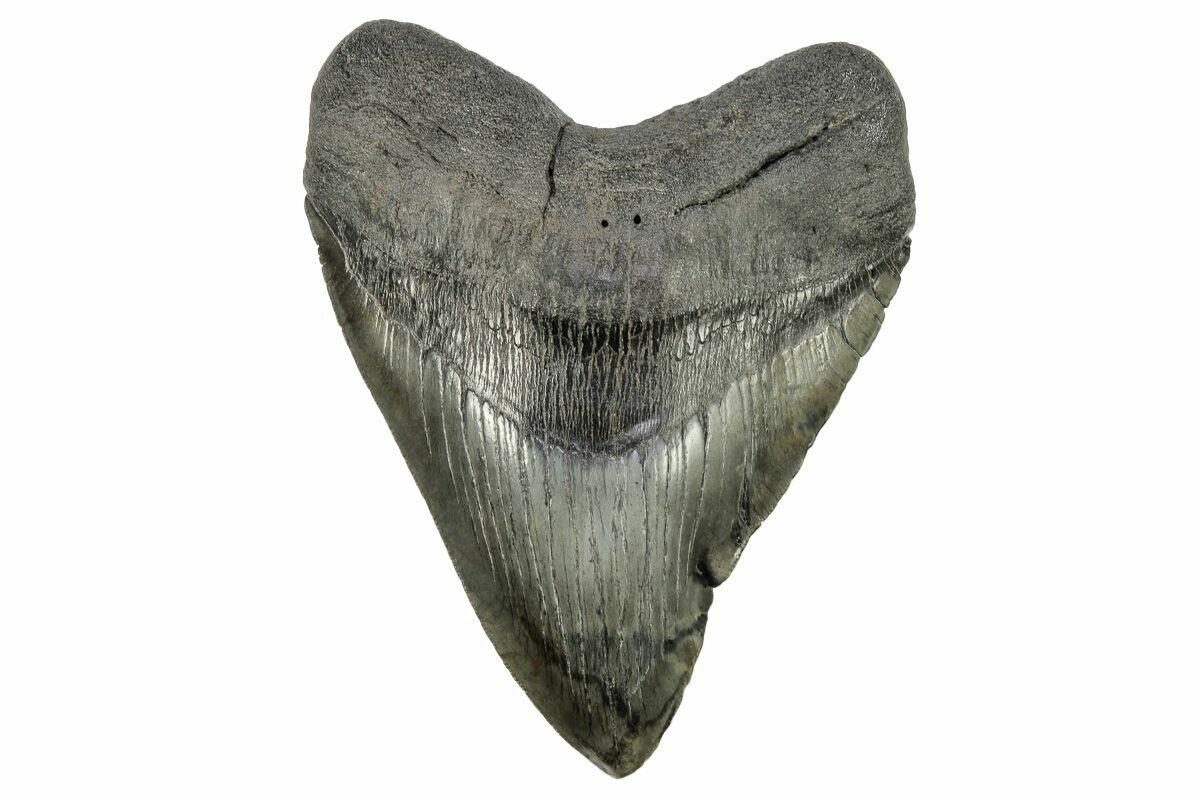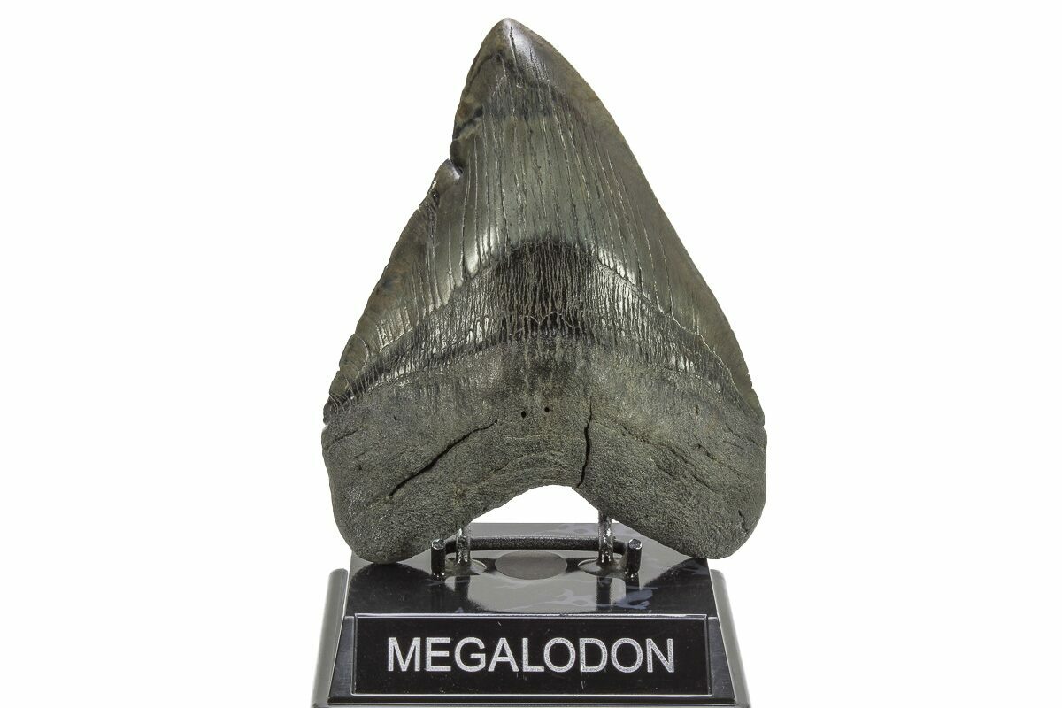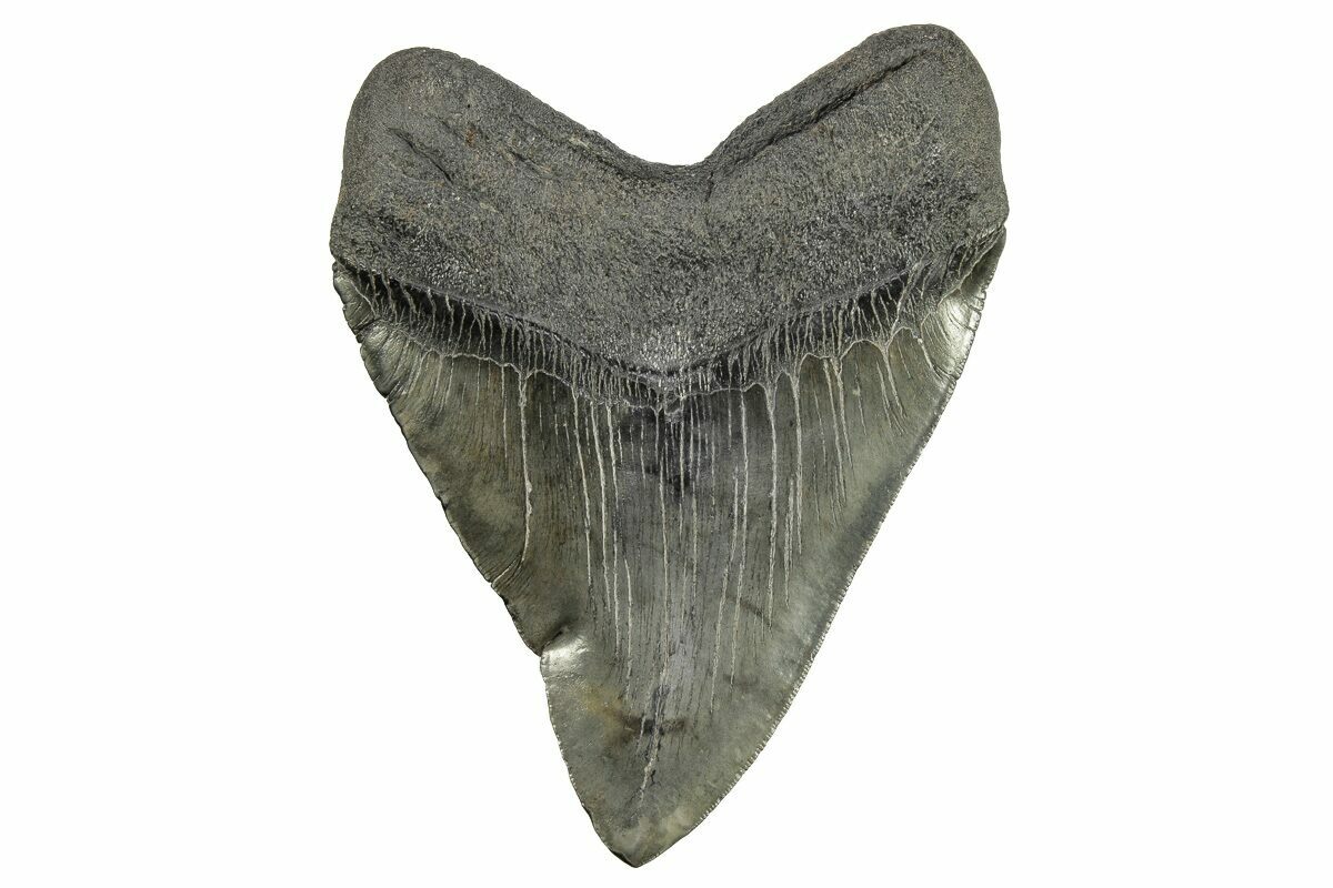 The standard measure for megalodon teeth is slant height, or the longest edge of the tooth. Adult megalodon teeth were typically in the 4 to 5 inch range: teeth over 6 inches are rare and represent super-sized individuals. Only a handful of teeth have ever been found over seven inches.