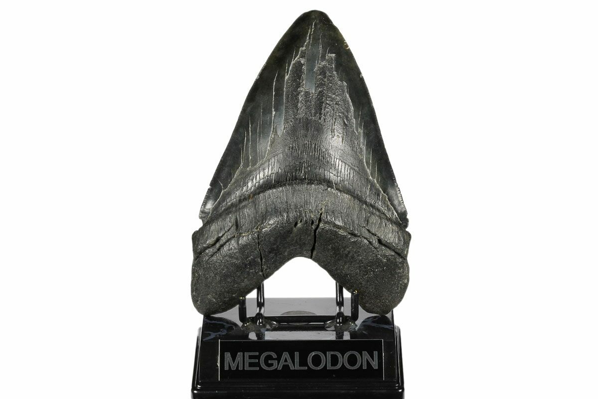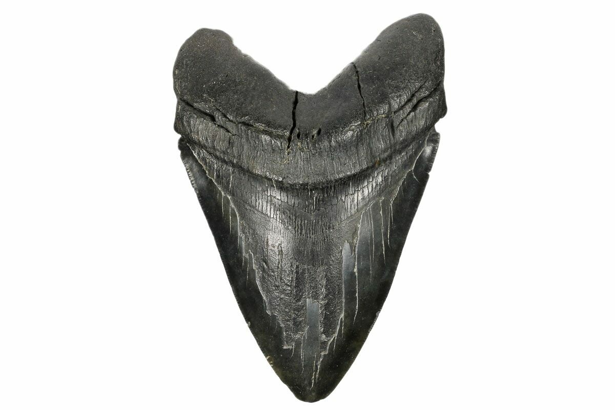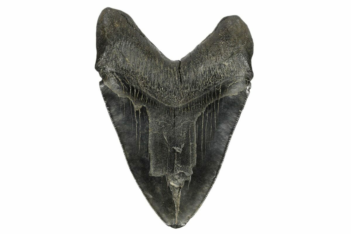 The standard measure for megalodon teeth is slant height, or the longest edge of the tooth. Adult megalodon teeth were typically in the 4 to 5 inch range: teeth over 6 inches are rare and represent super-sized individuals. Only a handful of teeth have ever been found over seven inches.