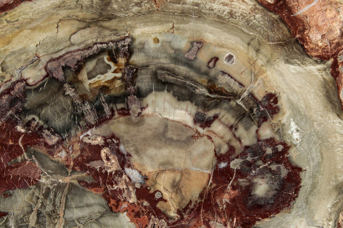 Madagascar petrified wood comes primarily from extensive Triassic-aged deposits in the Mahajanga Basin of northwestern Madagascar, where ancient conifer forests—often attributed to species related to Araucarioxylon—were buried by volcanic ash and floodplain sediments roughly 225–240 million years ago. Over immense spans of time, silica-rich fluids percolated through these sediments, replacing the cellular structure of the wood with chalcedony, jasper, agate, and quartz while preserving growth rings, bark textures, and even microscopic details. The region’s unique geochemistry—especially its iron, manganese, and occasionally copper content—produces the vivid palette Madagascar petrified wood is famous for, including deep brick reds, golden yellows, smoky blacks, and pastel pinks. Many logs are found fully silicified and naturally fractured into large, rounded segments that local artisans cut into slabs, spheres, eggs, and freeforms. These deposits stretch across arid badlands where erosion steadily exposes new material, making Madagascar one of the world’s premier sources of highly colorful, beautifully patterned fossil wood.