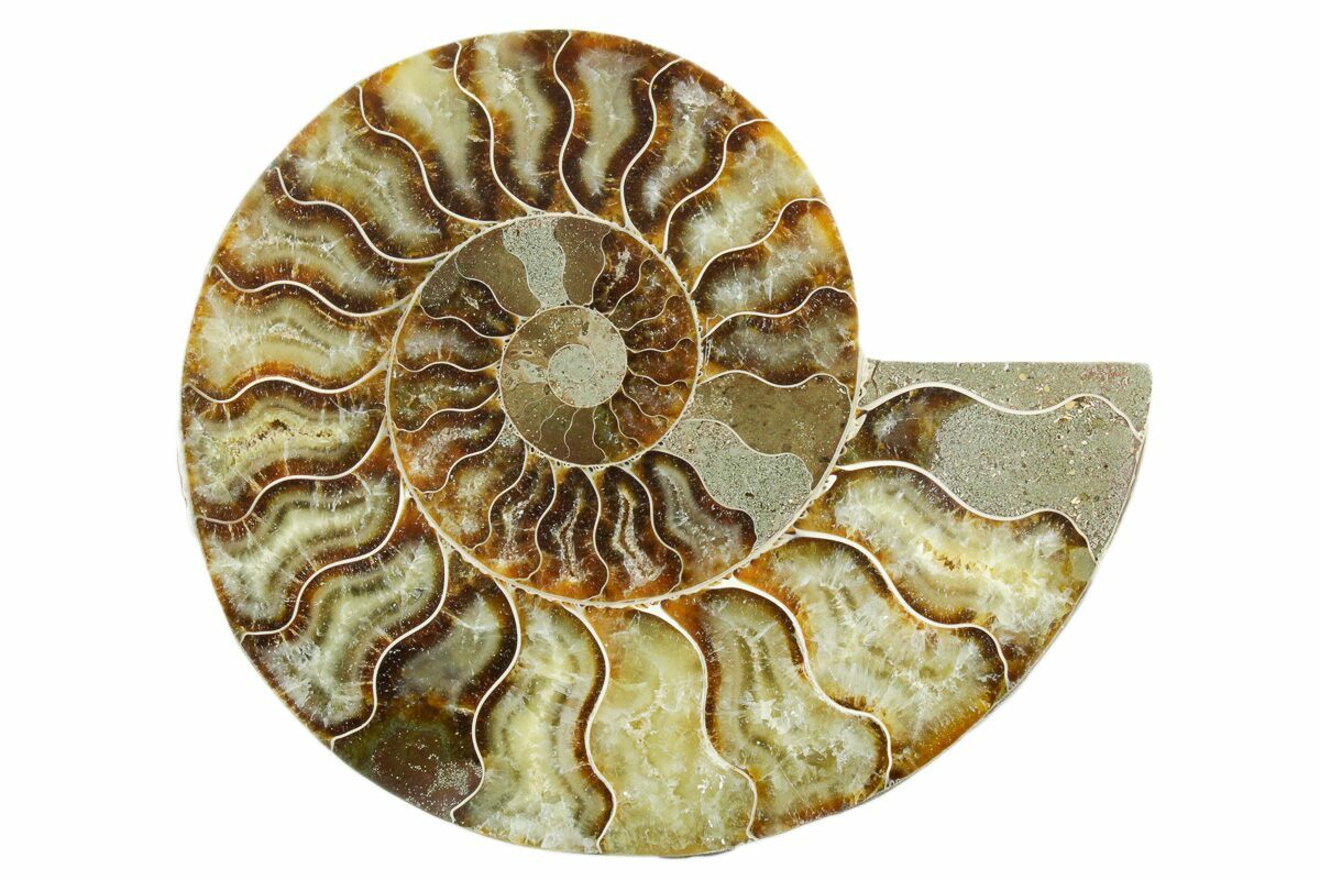 Here is a beautiful, 6.1" wide, cut and polished Cleoniceras ammonite fossil from Madagascar. These ammonites are Cretaceous in age, approximately 110 million years old. This specimen exhibits gorgeous mineralization within the chambers, each separated by white calcite septa (divisions). This highly polished, exotic ammonite makes a superb display piece with tremendous historical appeal.