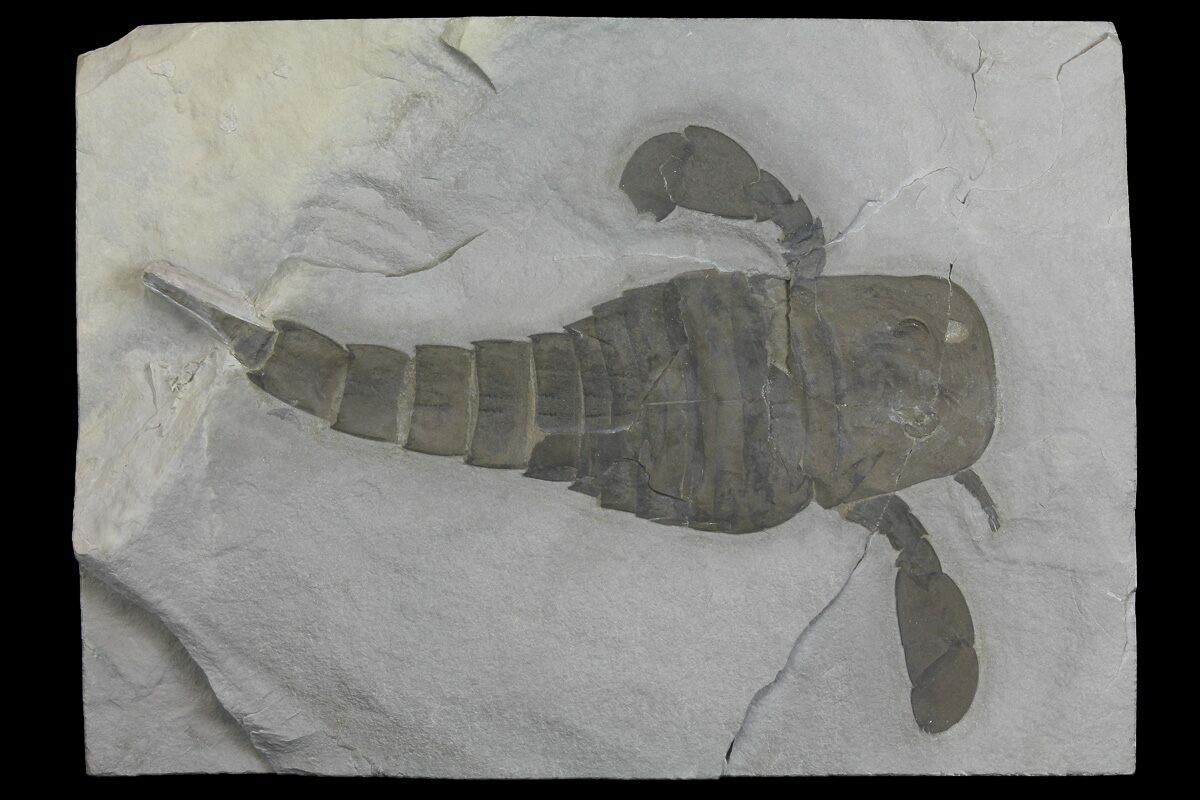 This is a really nice, 6.1" long Eurypterus remipes from Lang's Quarry in New York. The preservation is quite dark and both paddles are present. It's nicely centered on a solid slab of shale. There are a couple of crack repairs.