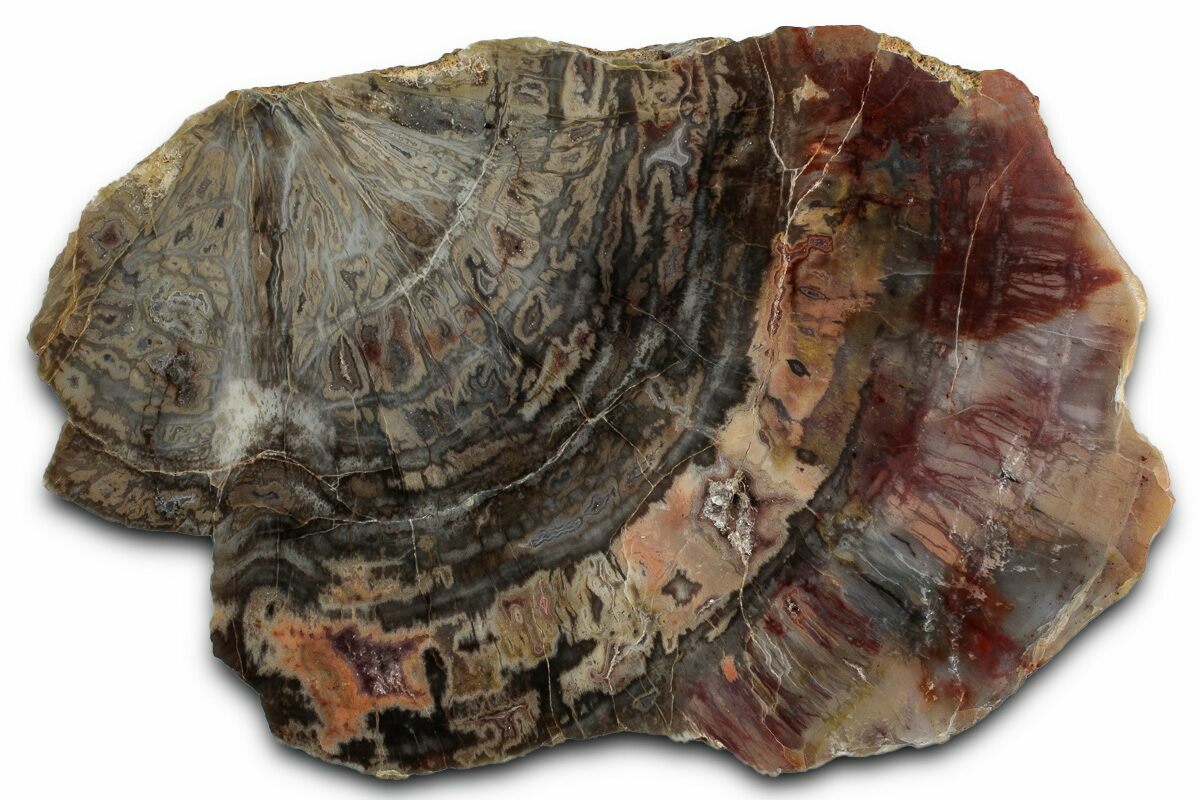 This is a brilliantly colored, 6.1" wide section of petrified wood (Araucarioxylon) from Arizona. One side of the petrified has been polished to a glossy finish, while the exterior surface has a natural texture.