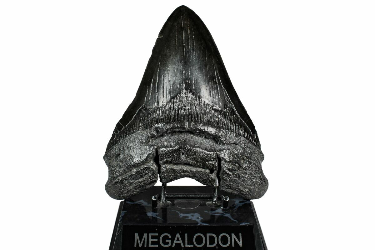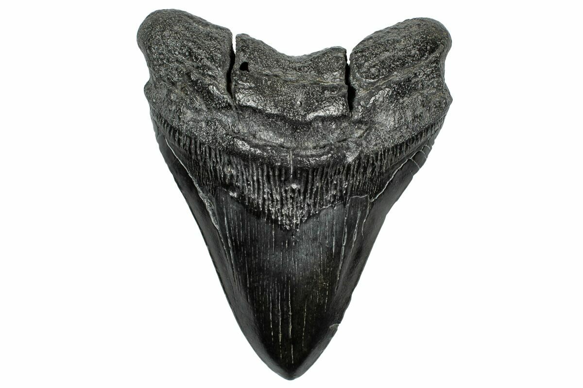 The standard measure for megalodon teeth is slant height, or the longest edge of the tooth. Adult megalodon teeth were typically in the 4 to 5 inch range: teeth over 6 inches are rare and represent super-sized individuals. Only a handful of teeth have ever been found over seven inches.