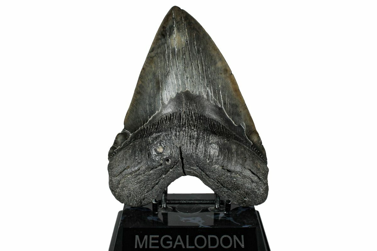 The standard measure for megalodon teeth is slant height, or the longest edge of the tooth. Adult megalodon teeth were typically in the 4 to 5 inch range: teeth over 6 inches are rare and represent super-sized individuals. Only a handful of teeth have ever been found over seven inches.