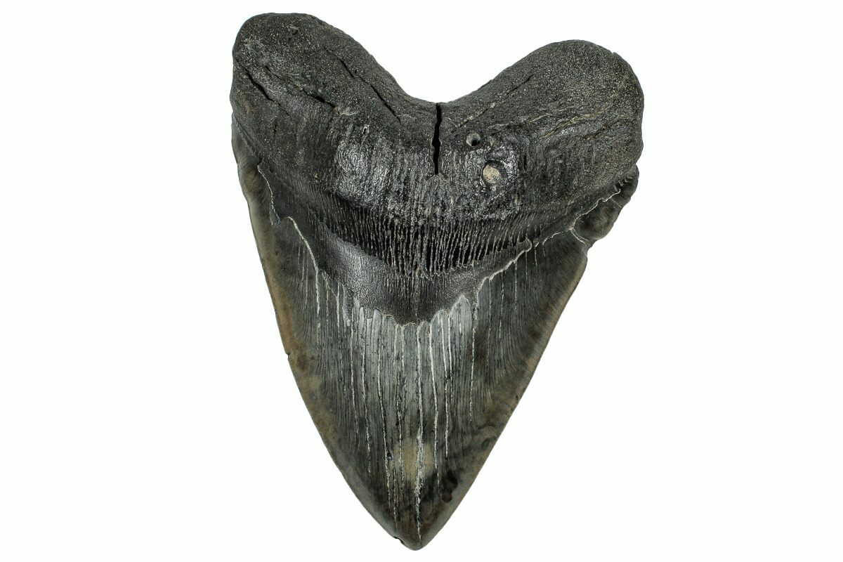 In addition to being huge, this tooth is all around in good condition. It has beautiful, mottled grey to black enamel color, pathological warping along the edge near the root, and some slight serration preservation. Like nearly all of the megs we sell it has no repair or restoration. A really beastly river meg.