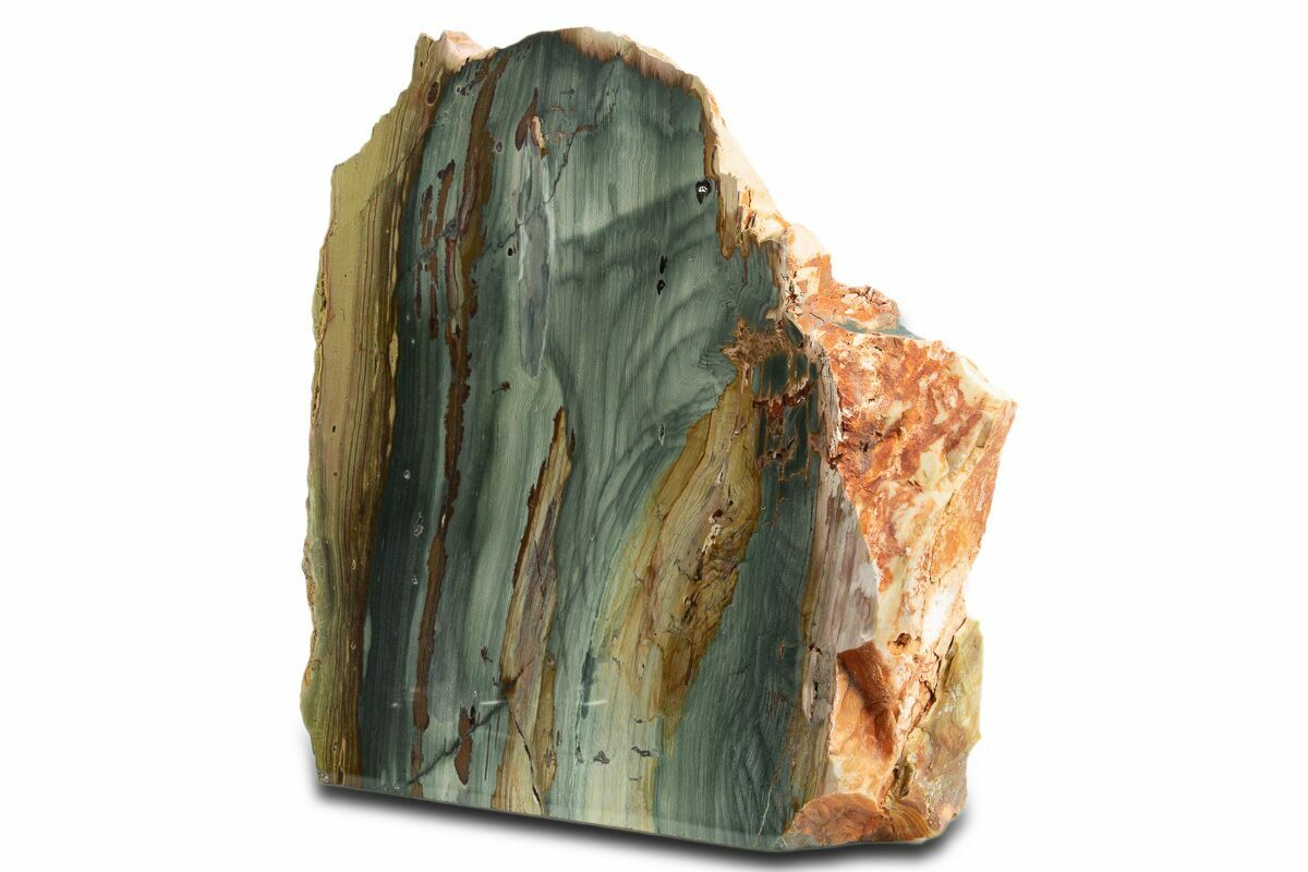Gary Green Jasper, also referred to as petrified bog wood or Larsonite, is a form of petrified wood from a location near McDermitt, Oregon on the Nevada/Oregon border. It is believed to be wood covered by volcanic activity between 11-15 million years ago. The volcanic event covered this area in debris that deprived the plants of oxygen, halting the decay process. Minerals from the volcanic ash then acted as the replacement material for this petrification/mineralization, giving the wood these vibrant colors.