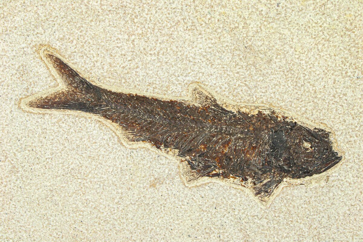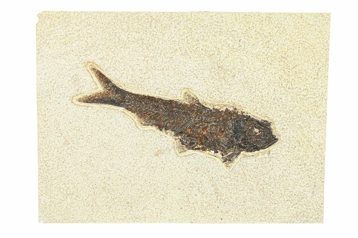 This beautiful, 6.2" long fossil fish (Knightia eocaena) from the Eocene-age Green River Formation in Wyoming. It is well-detailed and prepared with bone structure, fins, and scale structure visible.