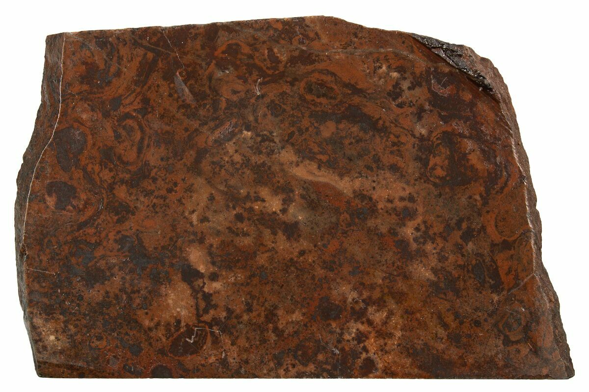 This is a 6.2" wide slice of an oncolitic Paleoproterozoic stromatolite fossil from an iron formation, collected from the Norrie Mine in Ironwood, Michigan. It has been cut flat and polished to a glossy finish.