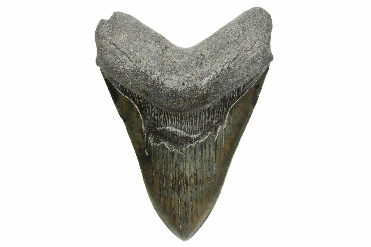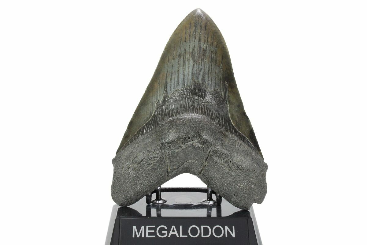 This tooth is in excellent condition for such a massive meg. It has colorful enamel, a good tip, mostly intact root and while the serrations are worn, some are still visible. Like nearly all of the Megalodon teeth we sell it has no repair or restoration.