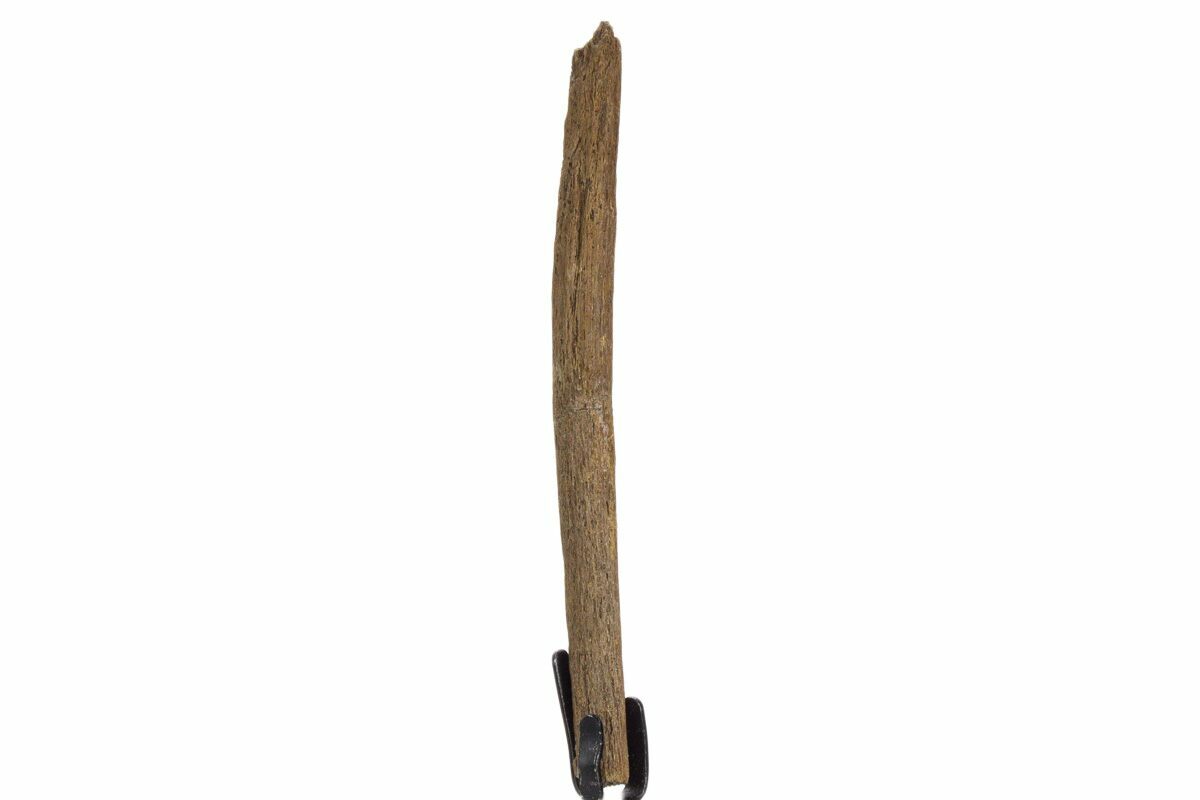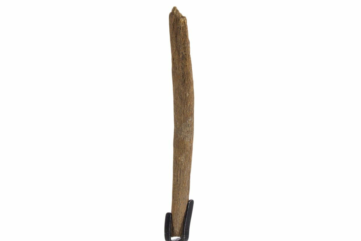 This is a 6.25" long fossil ceratopsian dinosaur (Triceratops horridus) ossified tendon from the Hell Creek Formation in South Dakota. It is accompanied by the pictured metal display stand.