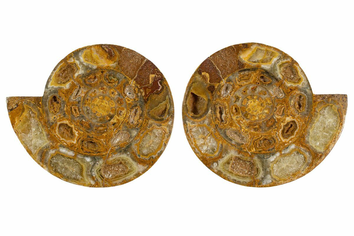 Some of these chambers are still partially hollow and lined with calcite crystals. The ammonite was cut in half and polished revealing the inner chamber structure of this ancient marine animal. There has been some repair work as these larger ammonites are almost always fractured while in the ground.