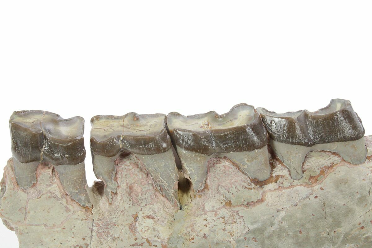 This is a 6.3" long mandible section from a running rhino (Hyracodon nebraskensis). It was collected from the the Brule Formation in South Dakota and would be approximately 30-33 million years old. There are four complete preserved teeth still embedded in the jaw.