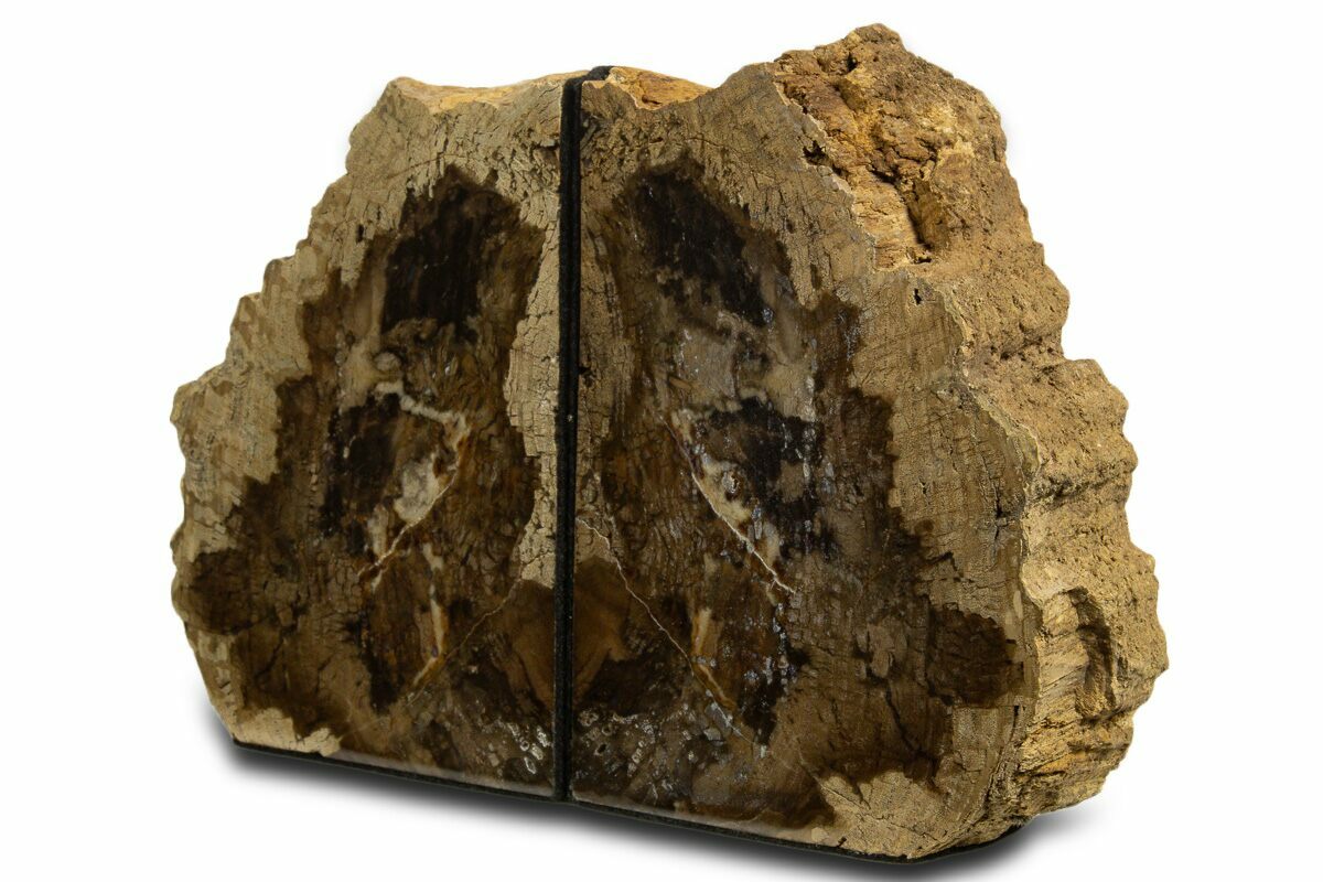 This is a pair of gorgeous bookends made from Miocene age petrified Fraxinus wood from the Trout Creek Formation in McDermitt, Oregon. The bookends have been polished on the outer face to highlight the details, and the flat edges have been lined with felt.