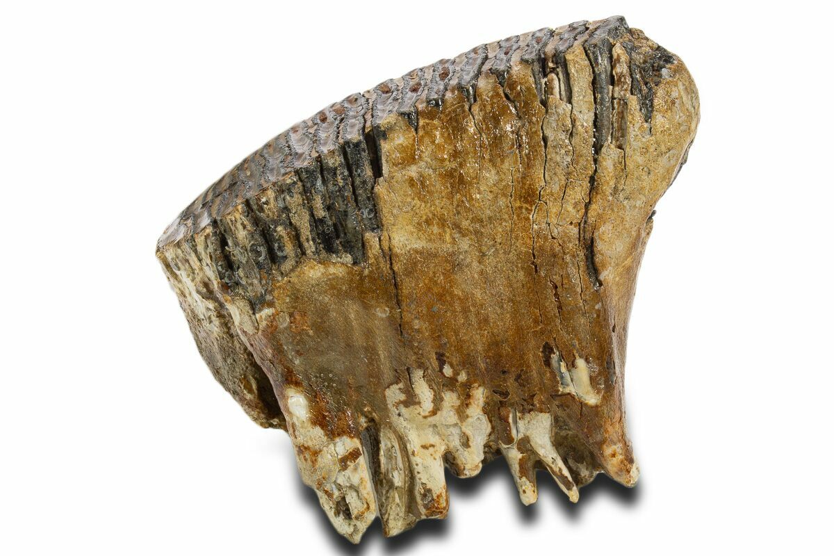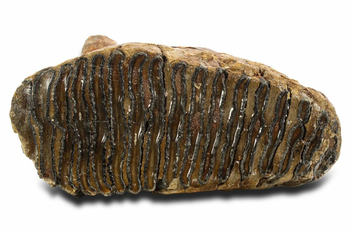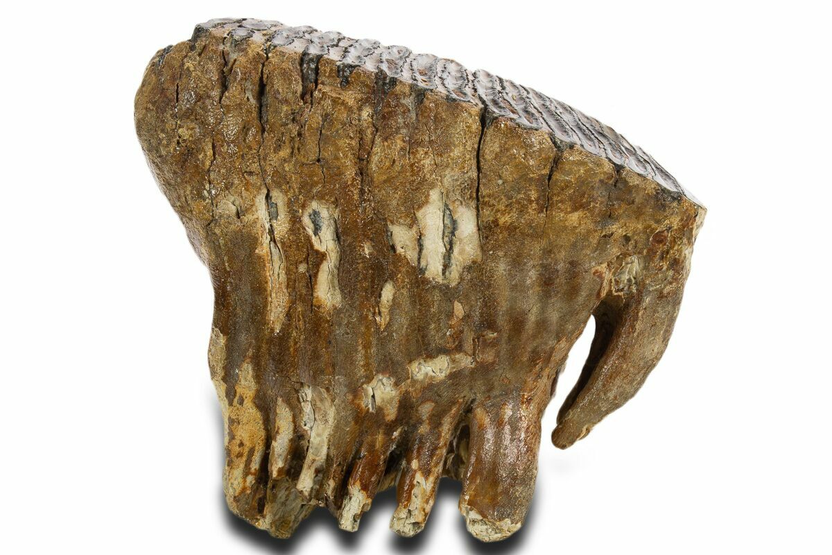 This is an Ice Age woolly mammoth (Mammuthus primigenius) molar. The molar is from the left side of the upper jaw in the M2 phase and belonged to a sub-adult. Portions of the roots are still intact on this specimen. This tooth was recovered from the 20-60,000 year-old North Sea deposits, which produce a huge quantity of well preserved bones of Ice Age mammals. This tooth is particularly well preserved with no restoration, displaying a nice chewing surface.