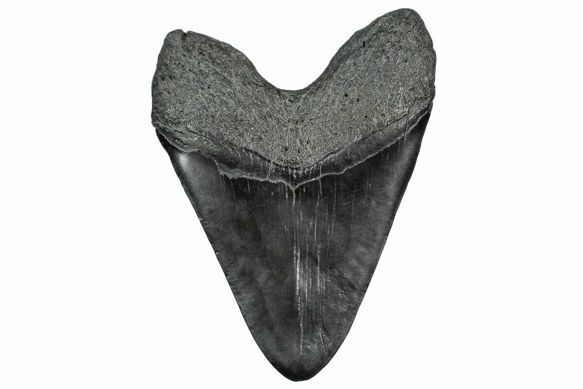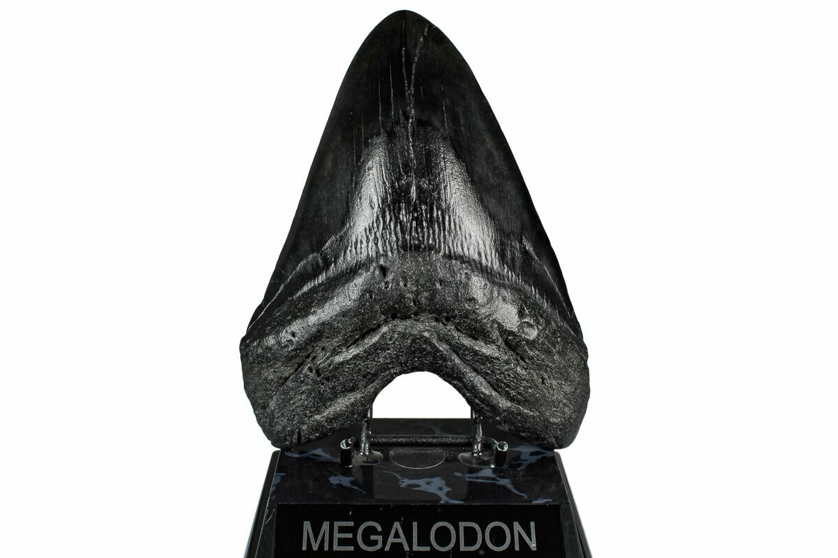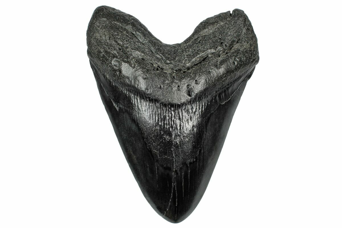 The standard measure for megalodon teeth is slant height, or the longest edge of the tooth. Adult megalodon teeth were typically in the 4 to 5 inch range: teeth over 6 inches are rare and represent super-sized individuals. Only a handful of teeth have ever been found over seven inches.
