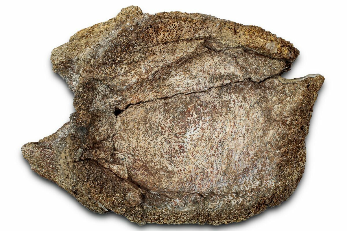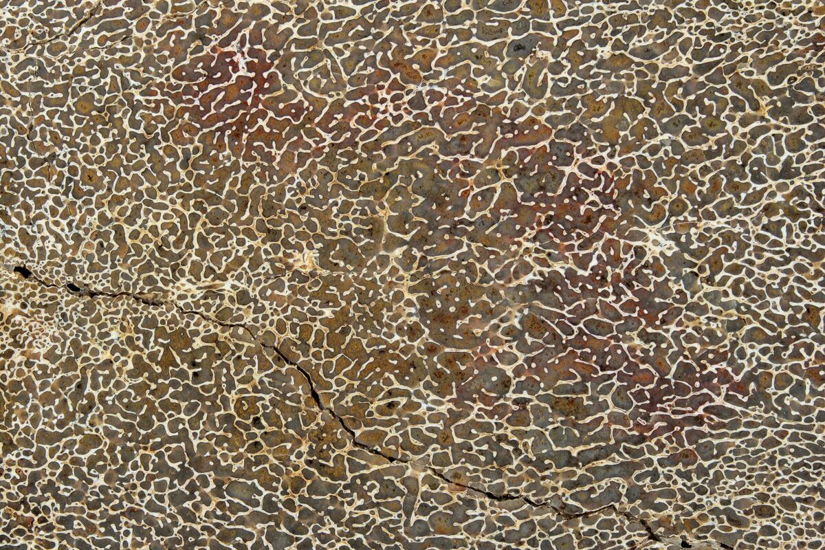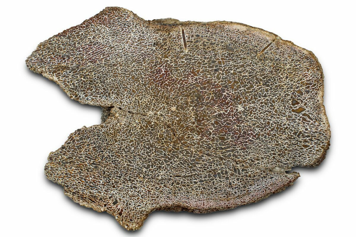 Dinosaur gembone (agatized dinosaur bone) forms when the porous structure of dinosaur bone is replaced by silica-rich minerals like agate, chalcedony, or jasper. This preserves the bone’s internal cell patterns, creating striking, web-like textures visible when polished.
