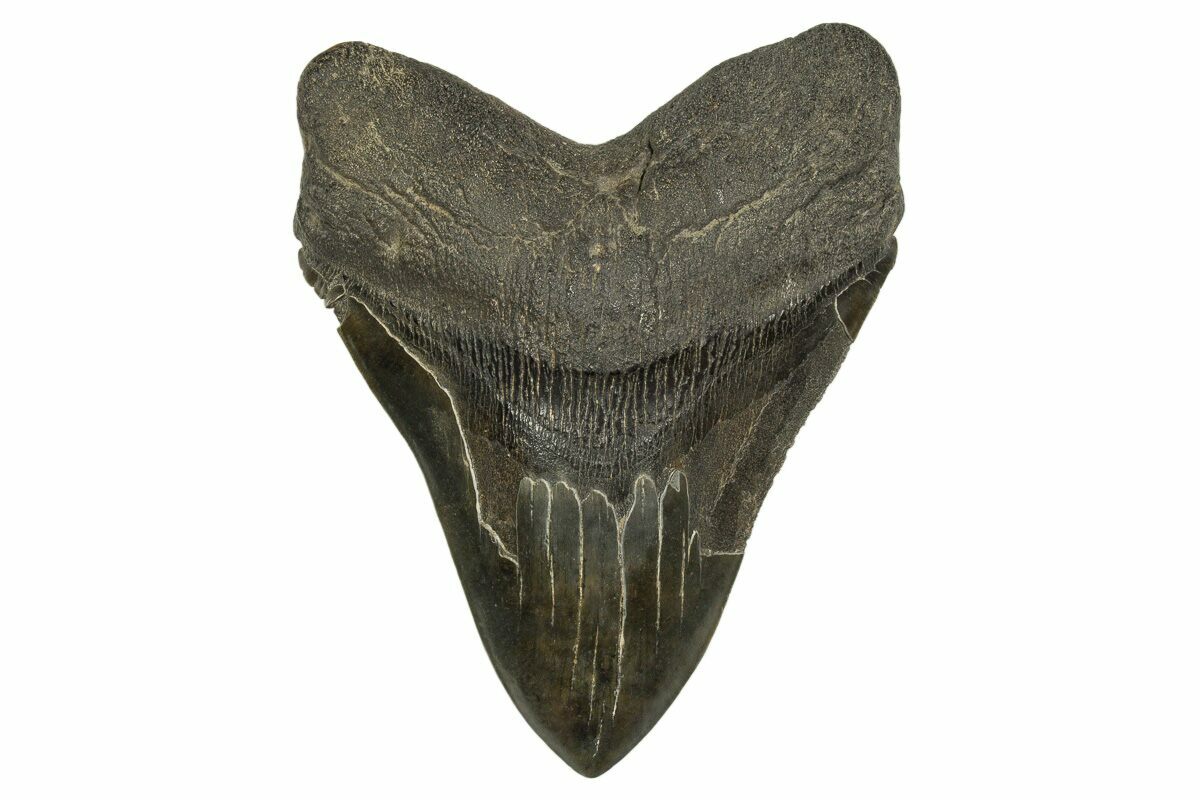 The standard measure for megalodon teeth is slant height, or the longest edge of the tooth. Adult megalodon teeth were typically in the 4 to 5 inch range: teeth over 6 inches are rare and represent super-sized individuals. Only a handful of teeth have ever been found over seven inches.