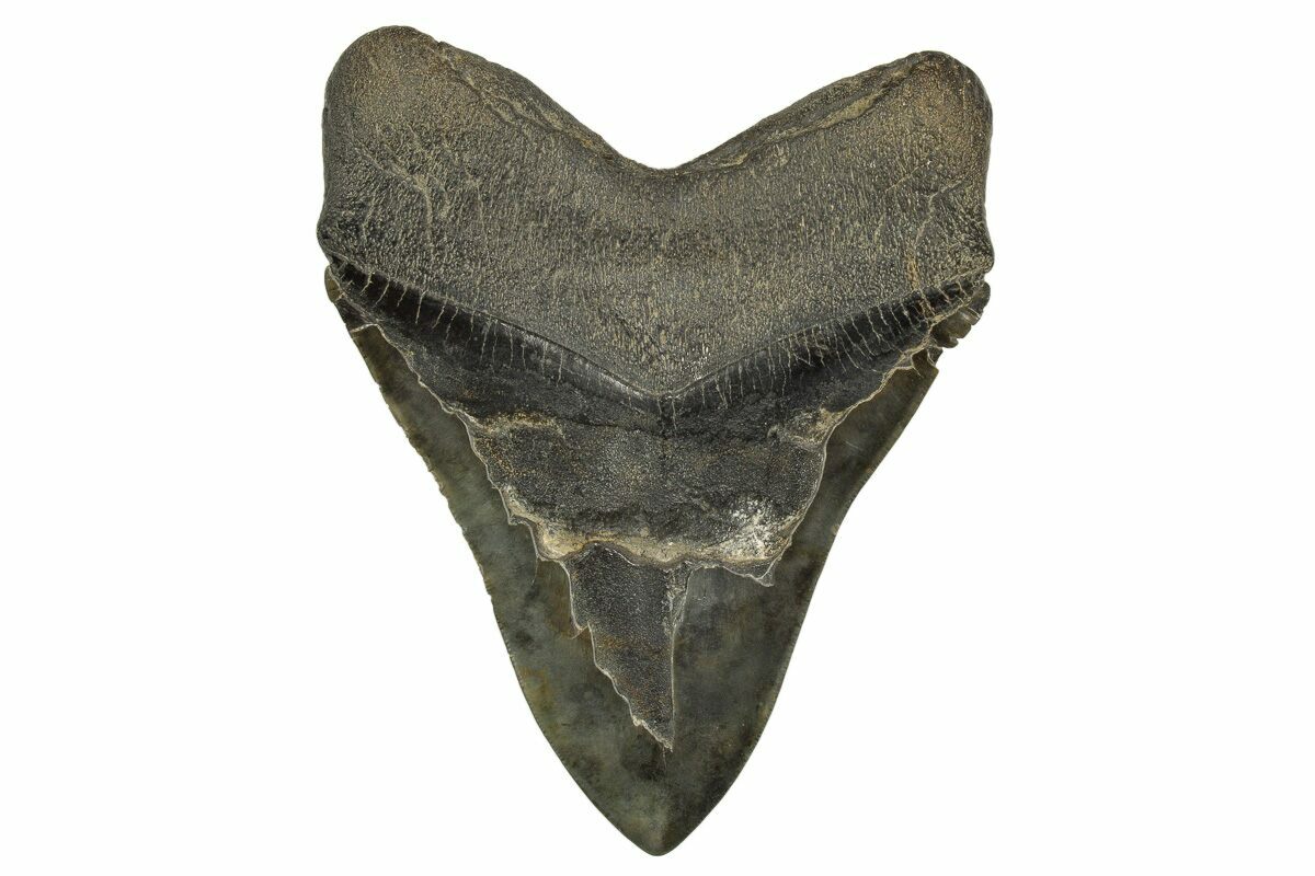 While the serrations are mostly worn, the enamel looks pretty nice and it has a good root. Like nearly all the meg teeth we sell there hasn't been any repair or restoration. Comes with the pictured display stand.
