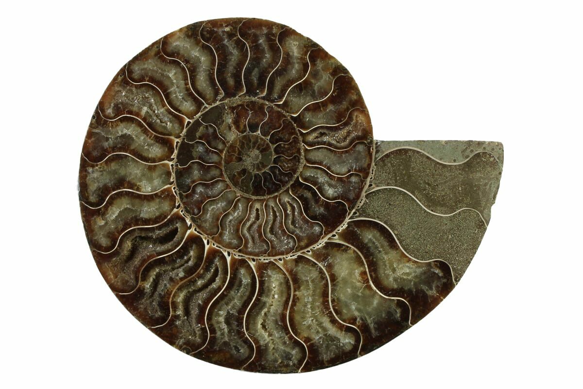 Here is a beautiful, 6.4" wide, cut and polished Cleoniceras ammonite fossil from Madagascar. These ammonites are Cretaceous in age, approximately 110 million years old. This specimen exhibits gorgeous mineralization within the chambers, each separated by white calcite septa (divisions). This highly polished, exotic ammonite makes a superb display piece with tremendous historical appeal.