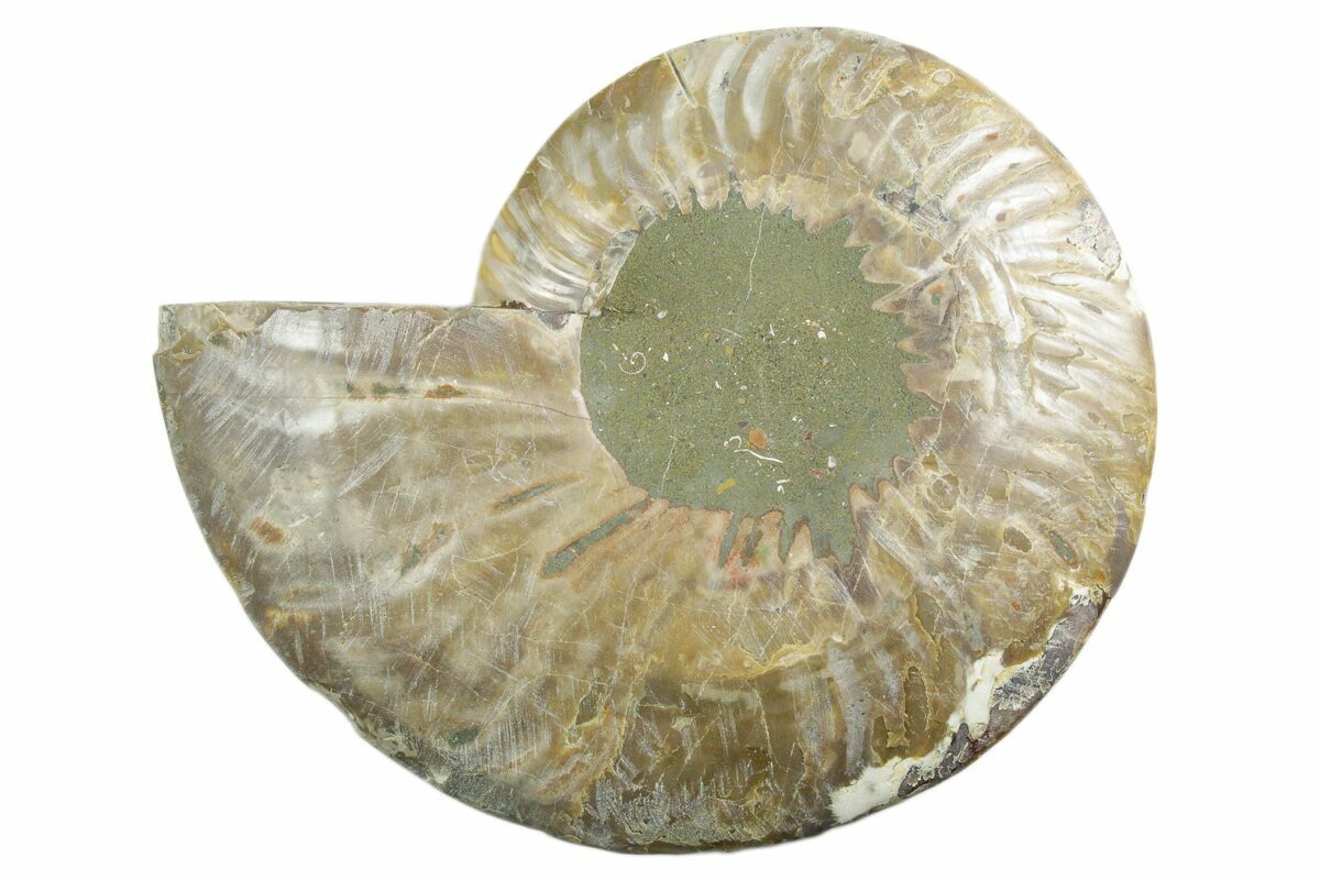 Here is a beautiful, 6.4" wide, cut and polished Cleoniceras ammonite fossil from Madagascar. These ammonites are Cretaceous in age, approximately 110 million years old. This specimen exhibits gorgeous mineralization within the chambers, each separated by white calcite septa (divisions). This highly polished, exotic ammonite makes a superb display piece with tremendous historical appeal.