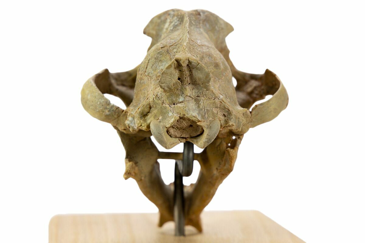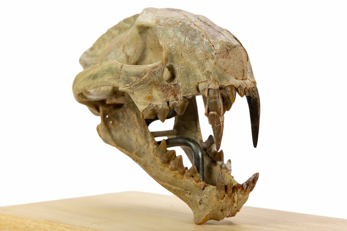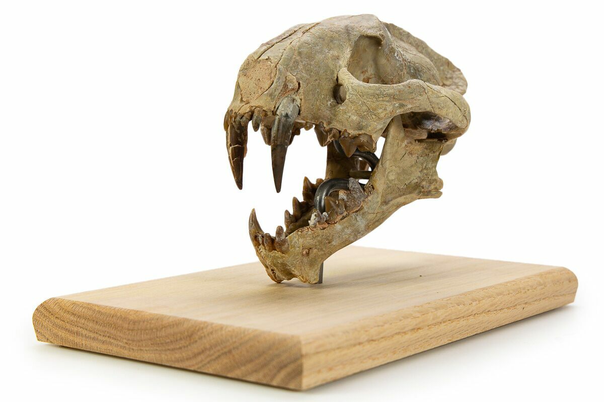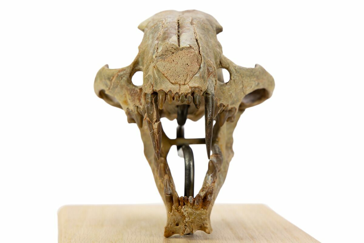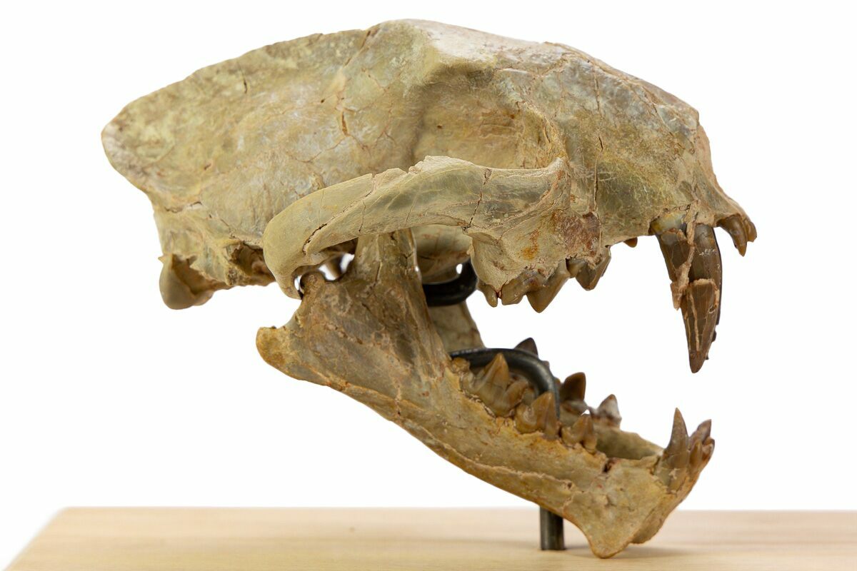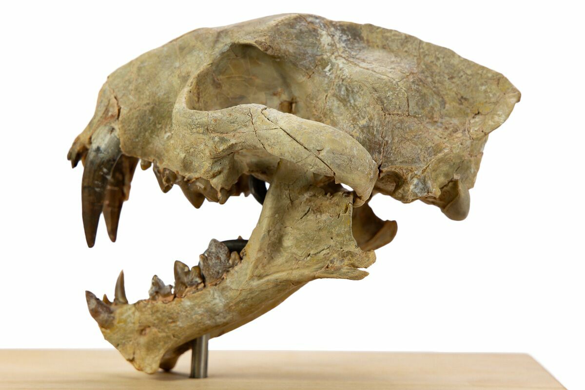 This is very rare find from the White River Formation of South Dakota, a complete skull of the "false saber-tooth cat", Dinictis squalidens. The skull measures 6.4" in length and is in phenomenal condition with no compositing and relatively little restoration - approximately 7-10%. It is accompanied by the pictured custom stand and base that the upper skull and mandible display on in articulated fashion, creating a fascinating, museum-quality display.