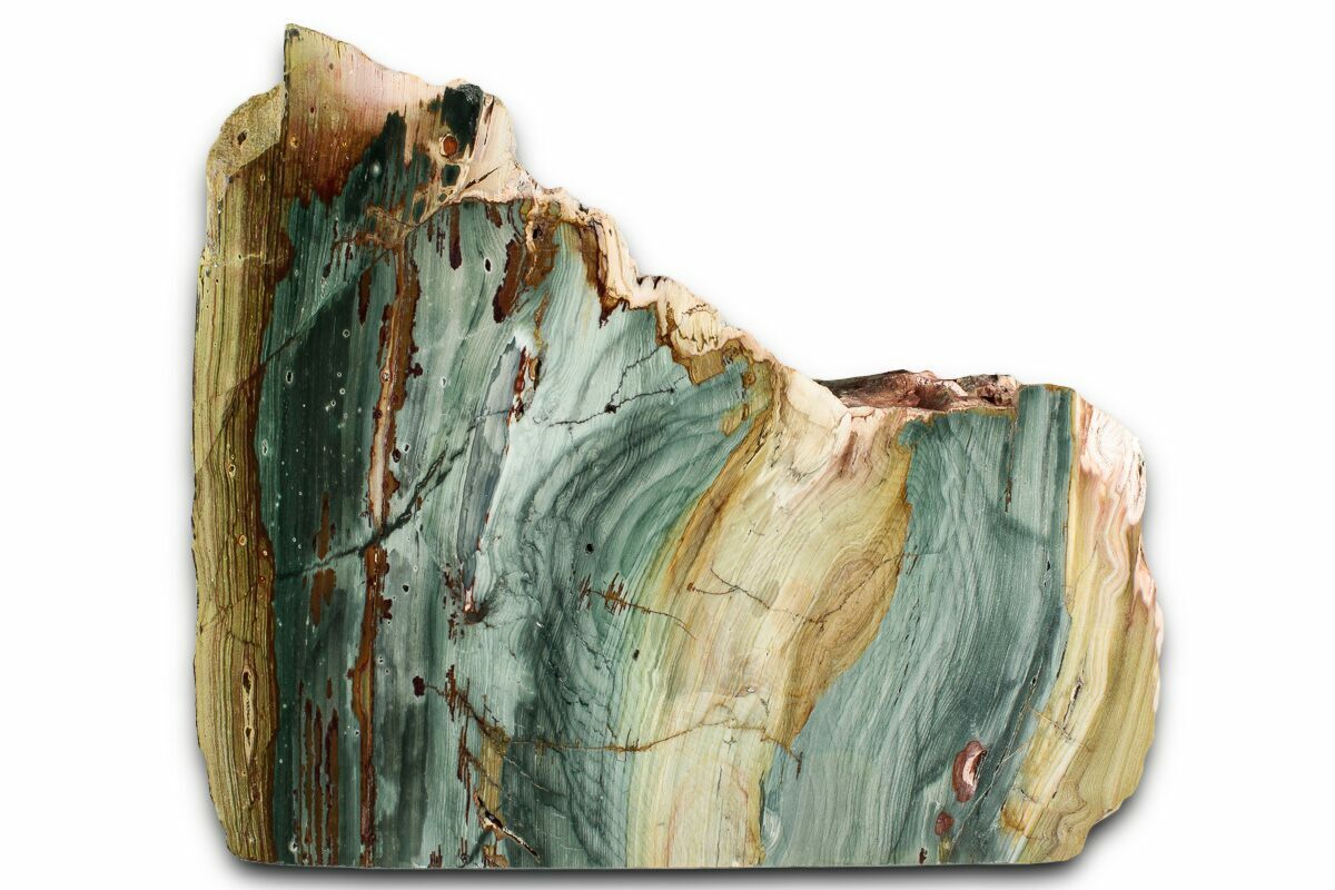 Gary Green Jasper, also referred to as petrified bog wood or Larsonite, is a form of petrified wood from a location near McDermitt, Oregon on the Nevada/Oregon border. It is believed to be wood covered by volcanic activity between 11-15 million years ago. The volcanic event covered this area in debris that deprived the plants of oxygen, halting the decay process. Minerals from the volcanic ash then acted as the replacement material for this petrification/mineralization, giving the wood these vibrant colors.