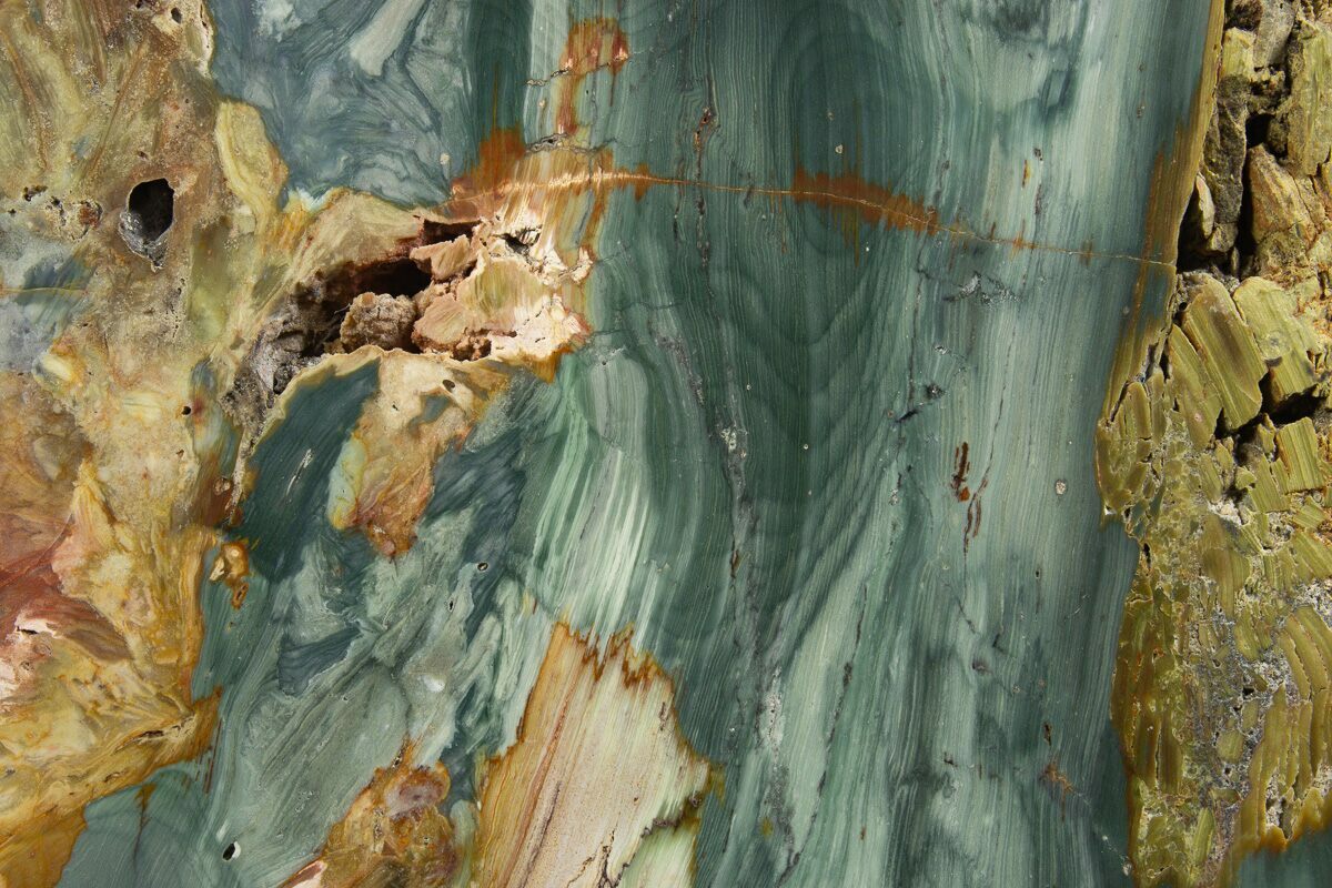 Gary Green Jasper, also referred to as petrified bog wood or Larsonite, is a form of petrified wood from a location near McDermitt, Oregon on the Nevada/Oregon border. It is believed to be wood covered by volcanic activity between 11-15 million years ago. The volcanic event covered this area in debris that deprived the plants of oxygen, halting the decay process. Minerals from the volcanic ash then acted as the replacement material for this petrification/mineralization, giving the wood these vibrant colors.