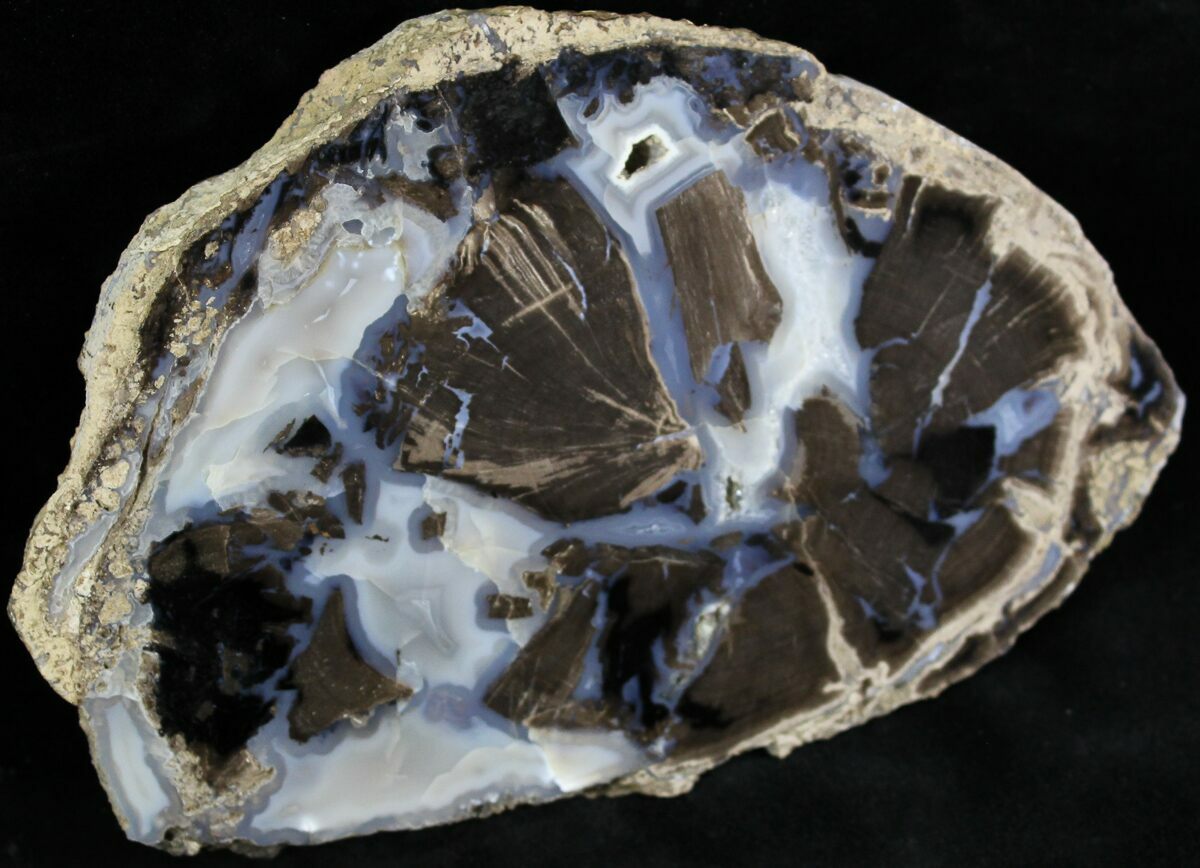 This is a beautiful slice of 50 million year old petrified wood from the famous "Blue Forest" in Eden Valley, Wyoming. It was formed when trees died and fell into a swamp where they were rapidly covered by algae. This formed casts that preserved the original bark surfaces of the trees and kept them from decaying. Eventually the algae casts and the spaces between them were filled in by minerals, often in exquisite, crystalline form.