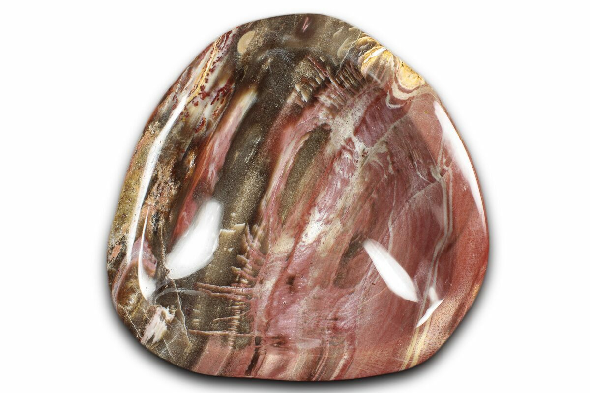 Madagascar petrified wood comes primarily from extensive Triassic-aged deposits in the Mahajanga Basin of northwestern Madagascar, where ancient conifer forests—often attributed to species related to Araucarioxylon—were buried by volcanic ash and floodplain sediments roughly 225–240 million years ago. Over immense spans of time, silica-rich fluids percolated through these sediments, replacing the cellular structure of the wood with chalcedony, jasper, agate, and quartz while preserving growth rings, bark textures, and even microscopic details. The region’s unique geochemistry—especially its iron, manganese, and occasionally copper content—produces the vivid palette Madagascar petrified wood is famous for, including deep brick reds, golden yellows, smoky blacks, and pastel pinks. Many logs are found fully silicified and naturally fractured into large, rounded segments that local artisans cut into slabs, spheres, eggs, and freeforms. These deposits stretch across arid badlands where erosion steadily exposes new material, making Madagascar one of the world’s premier sources of highly colorful, beautifully patterned fossil wood.