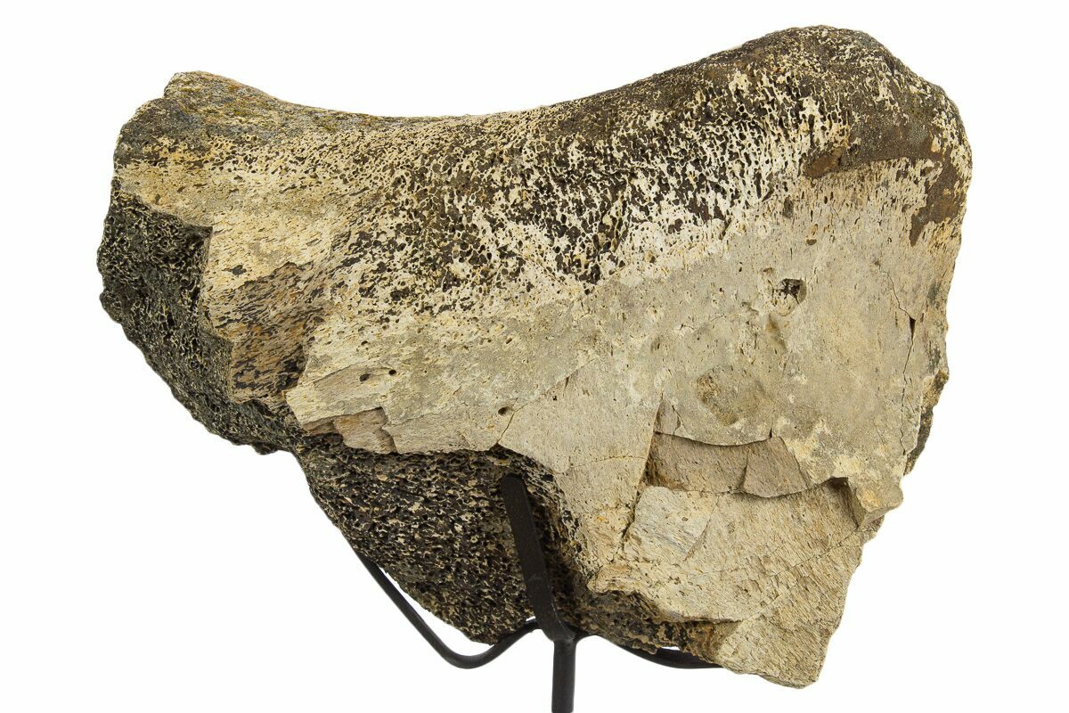 This is a 6.6" wide fossil ceratopsian dinosaur (Triceratops horridus) ischium bone (pelvic bone) section from the Hell Creek Formation in South Dakota. It is accompanied by the pictured metal display stand.