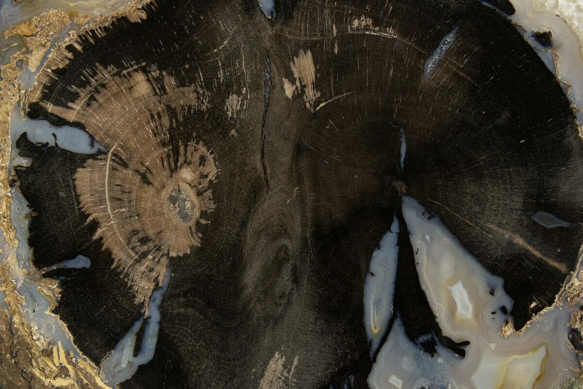 This is a 6.6" wide, polished round of a petrified wood (Schinoxylon) limb from the famous "Blue Forest" in Eden Valley, Wyoming. It shows amazing grain detail with agate inclusions and is double hearted (two separate piths). This colorful round of petrified wood has been highly polished on one side by one of the top polishers out there, displaying stunning wood grain details, agate-filled pockets, and yellow calcite. Under shortwave ultraviolet light, the agate exhibits a brilliant white-blue fluorescence.