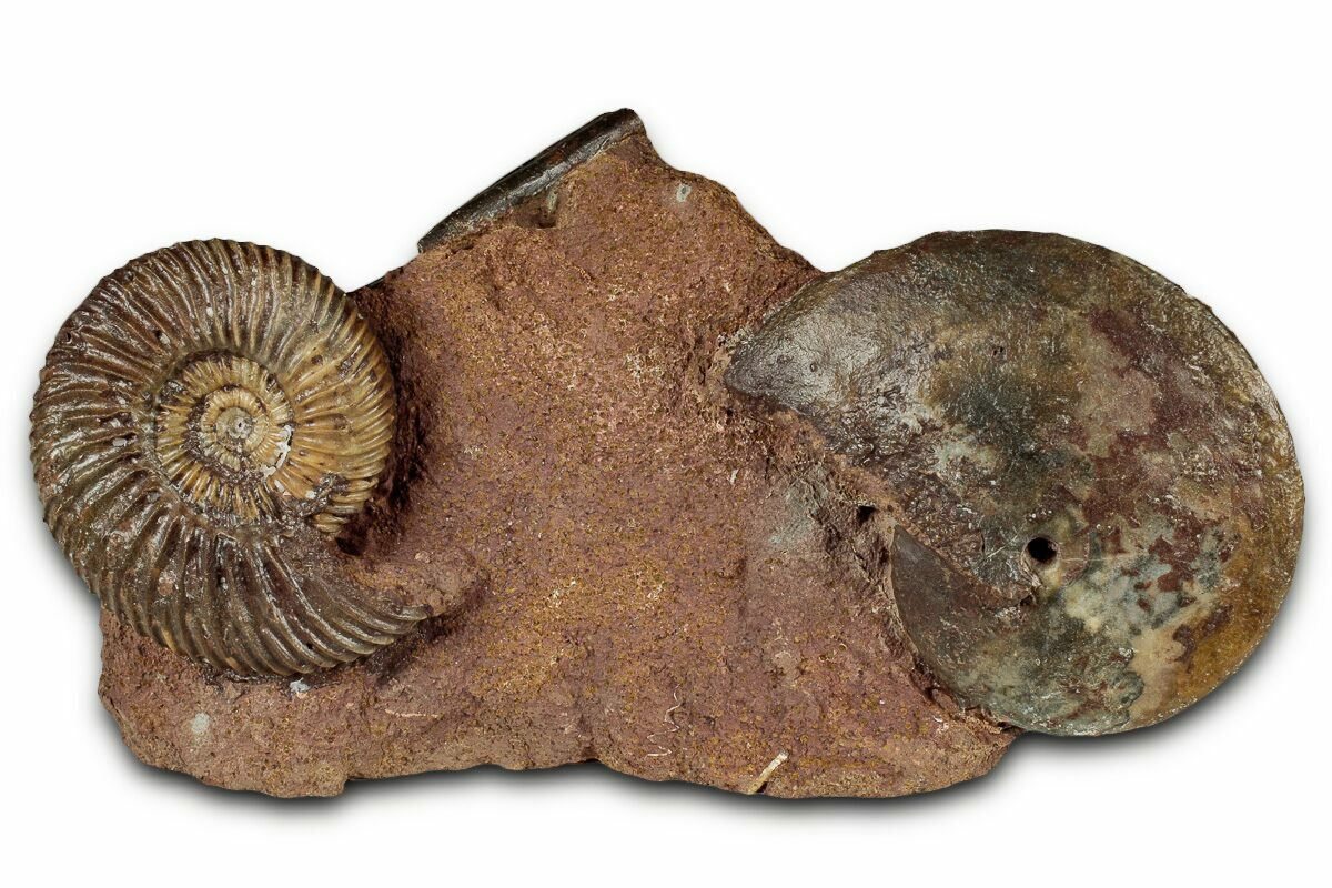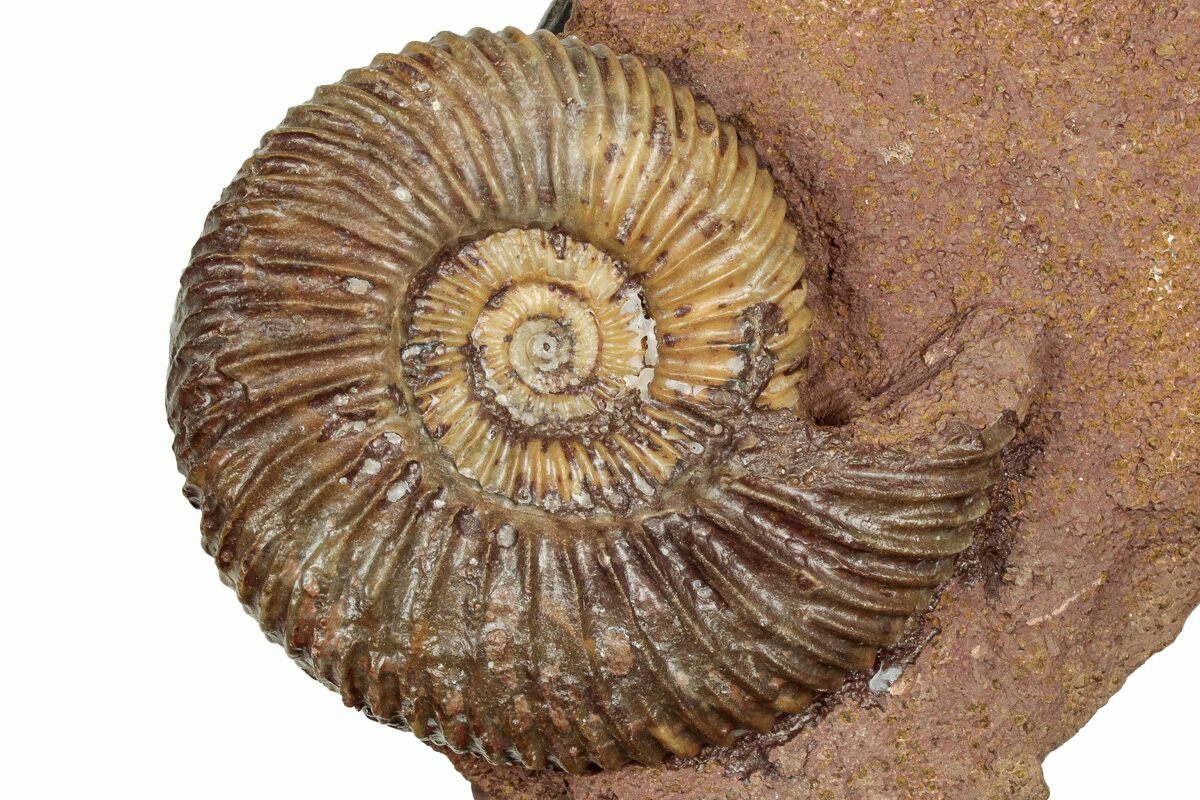 This is a beautiful, 6.6" wide Parkinsonia and Oxycerites ammonite fossil association from the Parkinsonien-Oolith within the Berching Subformation (Sengenthal Formation) of Germany. These Jurassic-age ammonites have been carefully exposed from the rock, with a section of rock still attached for presentation. Partial belemnites can be found within the remaining rock as well.
