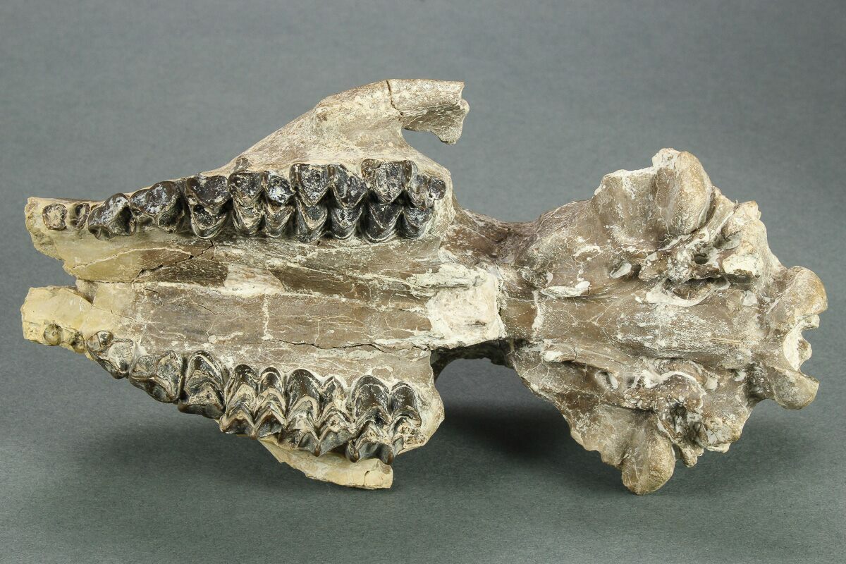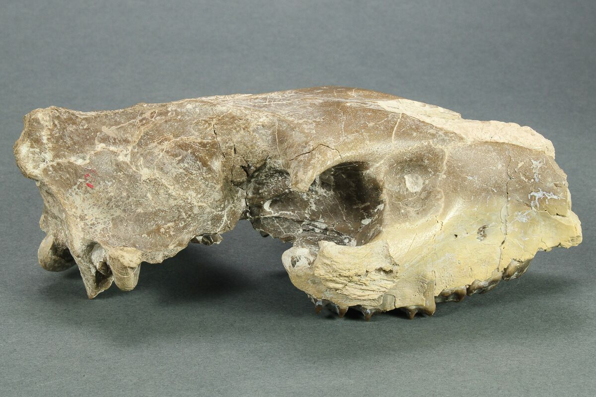This is a 6.6" long, partial upper skull of an oreodont (Merycoidodon culbertsoni). It was collected from the White River Formation in Sioux County, Nebraska and would be approximately 30-35 million years old. It contains 12 teeth.