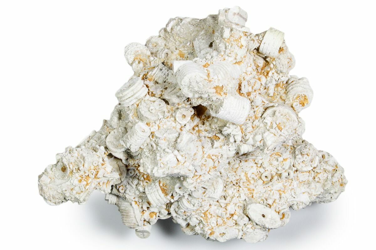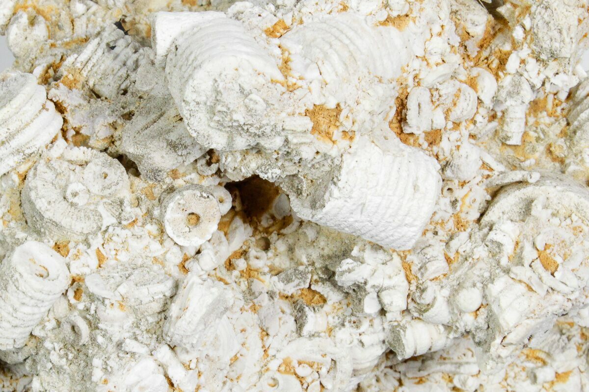 This is a section of rock that's packed with an assortment of fossil crinoid stems and multiple cephalopod segments. They were collected within their natural matrix and have since been prepared using mechanical tools to expose them further. This specimen was collected from the Carboniferous (Mississippian) age Fort Payne Formation in Clinton County, Kentucky.