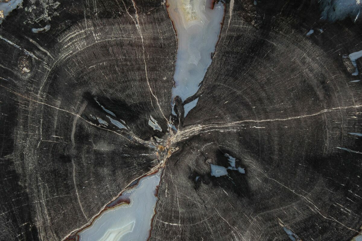 This petrified wood was formed when trees died and fell into a swamp where they were rapidly covered by algae. This formed casts that preserved the original bark surfaces and kept the trees from decaying. Eventually the algae casts and the spaces between them were filled in by minerals, often in exquisite crystalline form. These casts have preserved incredibly fine details in the wood, providing researchers with a wealth of information about these ancient trees. A paper on the formation of this petrified wood can be found at the link below.