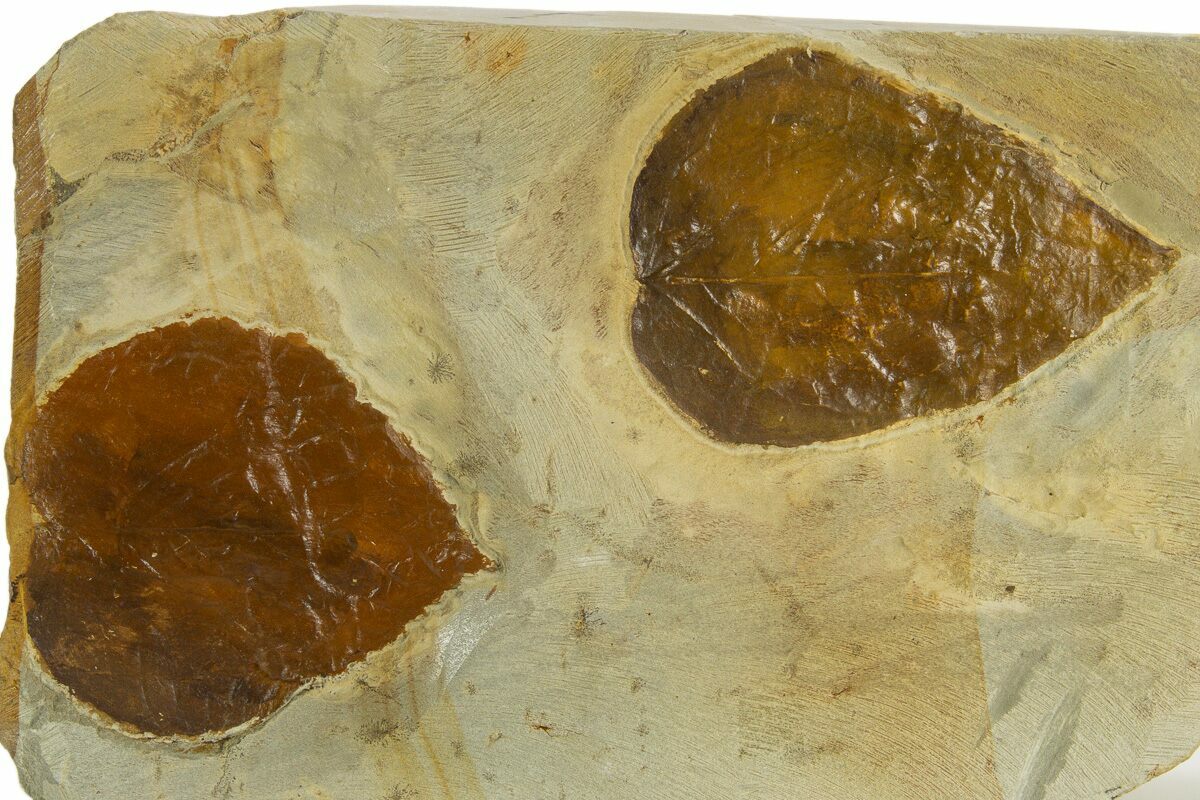 These are two fossil leaves from the Fort Union Formation near Glendive, Montana. The plate consists of one leaf each of the species Davidia antiqua and "Cimmamomum" sezannense. The dark orange/brown preservation contrasts well against the shale, and many of the details in the leaves can be seen in good relief. There may be some touchups to the surface of the leaves where pieces of them flaked onto the negative during collection.