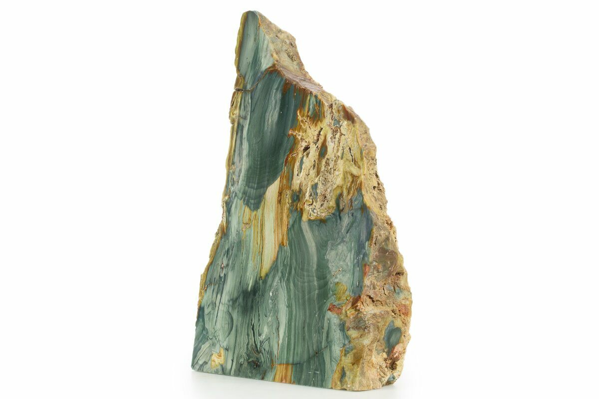 This is a 6.75" tall section of jasper replaced petrified wood that was collected near McDermitt, Oregon. This section has been polished to a glossy finish on one side and the base has been cut flat for aesthetic presentation. It has absolutely stunning blue and green coloration.