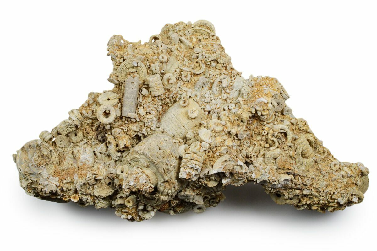 This is a section of rock that's packed with an assortment of fossil crinoid stems and multiple cephalopod segments. They were collected within their natural matrix and have since been prepared using mechanical tools to expose them further. This specimen was collected from the Carboniferous (Mississippian) age Fort Payne Formation in Clinton County, Kentucky.