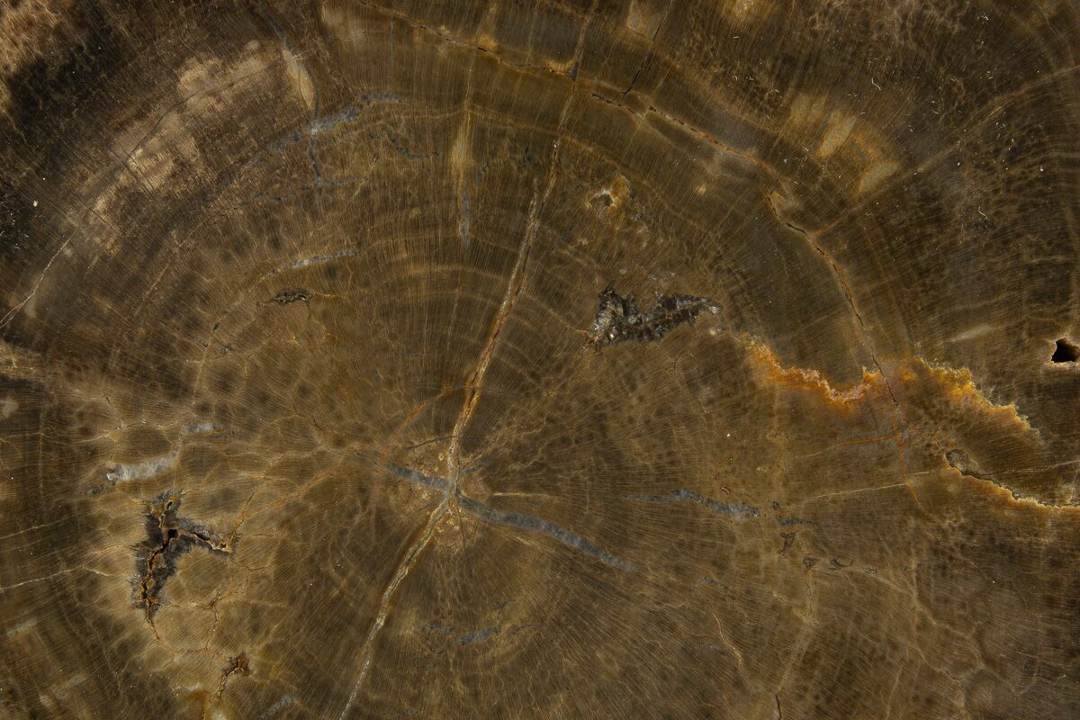 Petrified wood is the name given to wood that has been turned into stone (fossilized) through the process of permineralization. In this process, all of the organic matter becomes replaced by minerals, while much of the original structure, such as tree rings, is retained. For this to happen, the wood needs to be buried in an environment low in oxygen to prevent decomposition and with flowing, mineral-laden water, so minerals may replace structures. The coloration is caused by various minerals/impurities present in the water during fossilization. For example, red colors in many cases can be attributed to iron compounds, greens due to copper, and so on.