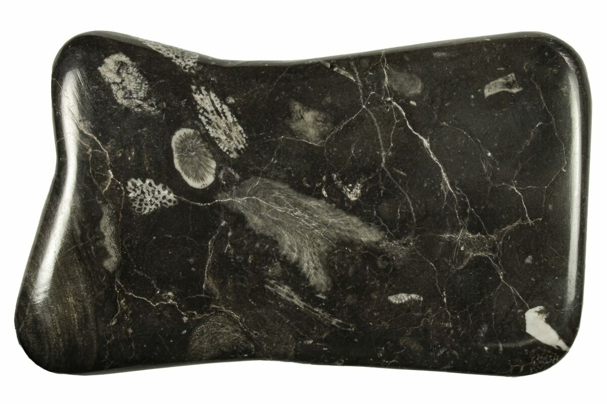 This is a 6.8" wide plate of coral and bryozoan cross sections, collected from Issoumour, Morocco. The fossils come from a Devonian-aged marine deposit and their white preservation contrasts nicely against the black rock. The specimen has been nicely polished across one face and along the periphery to reveal these interesting fossils, which are visible across both sides of the plate.