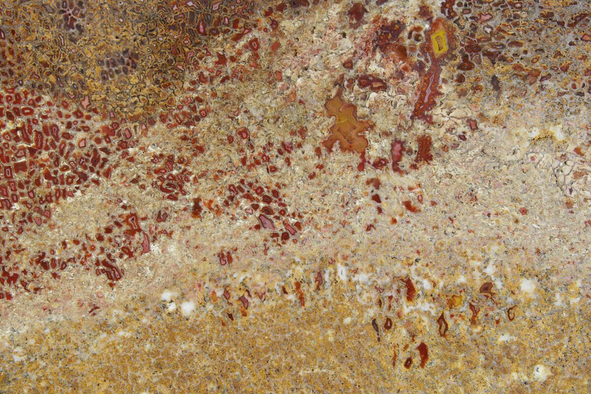 Dinosaur gembone (agatized dinosaur bone) forms when the porous structure of dinosaur bone is replaced by silica-rich minerals like agate, chalcedony, or jasper. This preserves the bone’s internal cell patterns, creating striking, web-like textures visible when polished.