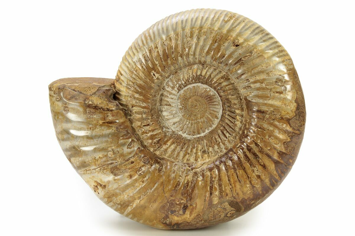This is a 6.9" wide ammonite (Perisphinctes sp.) fossil that was collected near Sakaraha in the Tulear Province of Madagascar. It is Jurassic (Oxfordian Stage) in age or approximately 160 million years old. It has well-defined ribbing and is quite heavy for its size. The exterior has been lightly polished.