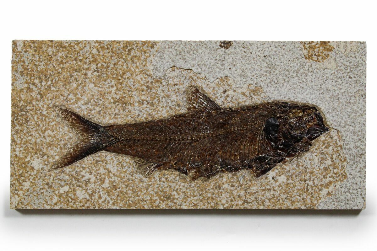 This is a beautifully preserved 6" long fossil fish (Knightia eocaena) from the Eocene-aged Green River Formation in Wyoming. It is well-detailed and prepared with bone structure, fins, and scale structure visible. The fish is nicely centered on a rectangular cut slab of rock