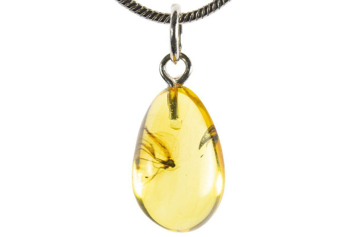 This is a .6" tall (including loop) pendant made from 44 million year old Baltic amber. Within the amber, a small fossil fly (order Diptera) can be seen. A loop has been attached to the amber, along with a secondary ring for the included 24" silver plated snake chain to complete the necklace.