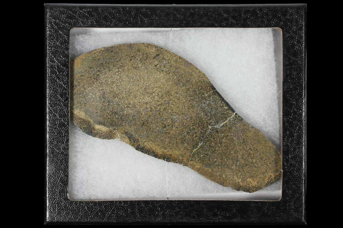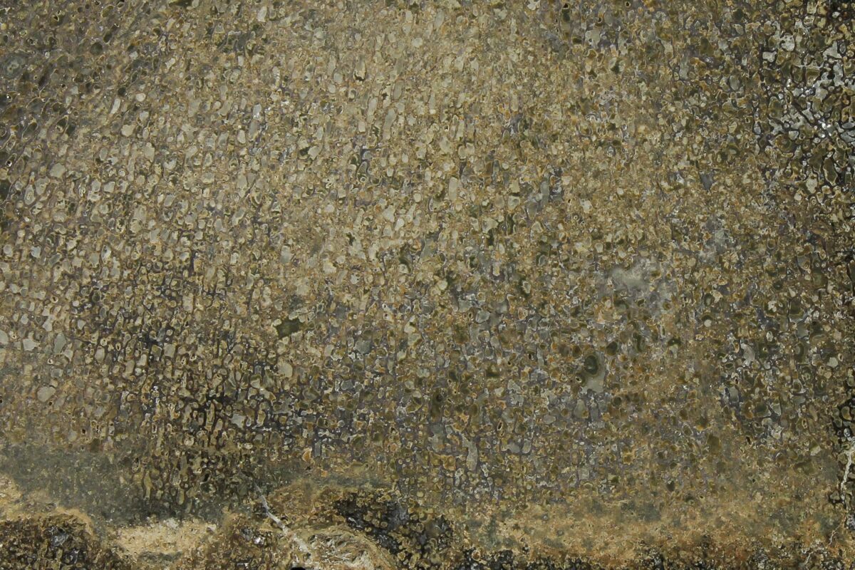 This 6" wide is a slab of polished, Iguanodon bone showing stunning internal cell structure. It was collected from the Lower Cretaceous, Wealden Clay Formation on the Isle of Wight. While complete or near complete bones are rare, water tumbled chunks are often found after they erode out of the cliffs on the isle.