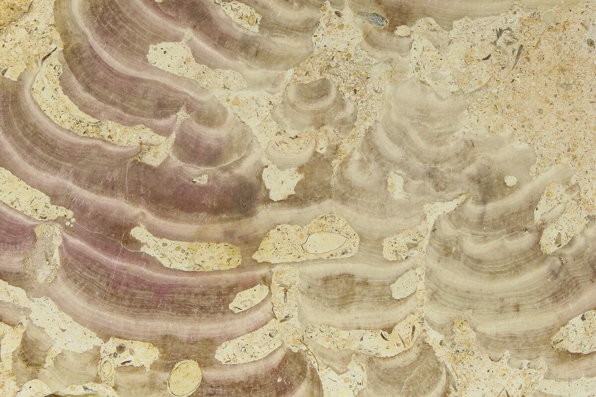 This is a Jurassic-aged fossil chaetetid sponge of the species Solenopora jurassica from Gloucestershire, England. Locally these sponge fossils are known as "Beetroot Rock" because of their coloration. The fossil has been cut and polished to a glossy finish to highlight the intricate details.