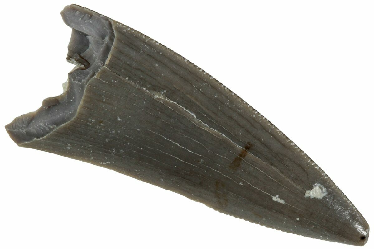 This is a .6" long, serrated, Triassic reptile (Postosuchus?) tooth from the Chinle Formation of Arizona. It has beautiful black-grey preservation and fine serrations.