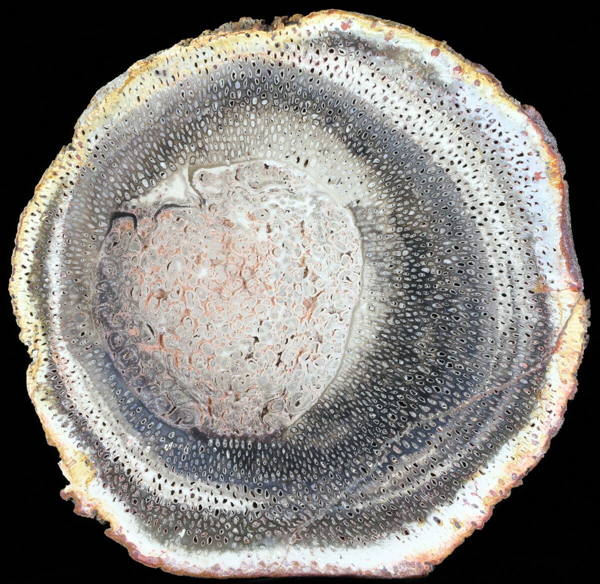 This is a colorful, 6" wide slab of Permian aged petrified wood from the tree fern, Tietea singularis. The inner wood detail is very fascinating and it has a bright pinkish-red color. It comes from the Araguania petrified forest of Brazil and there is only one legal mining claim in the region. It has been nicely polished on one side to display the very interesting, fossilized internal structure of the plant.